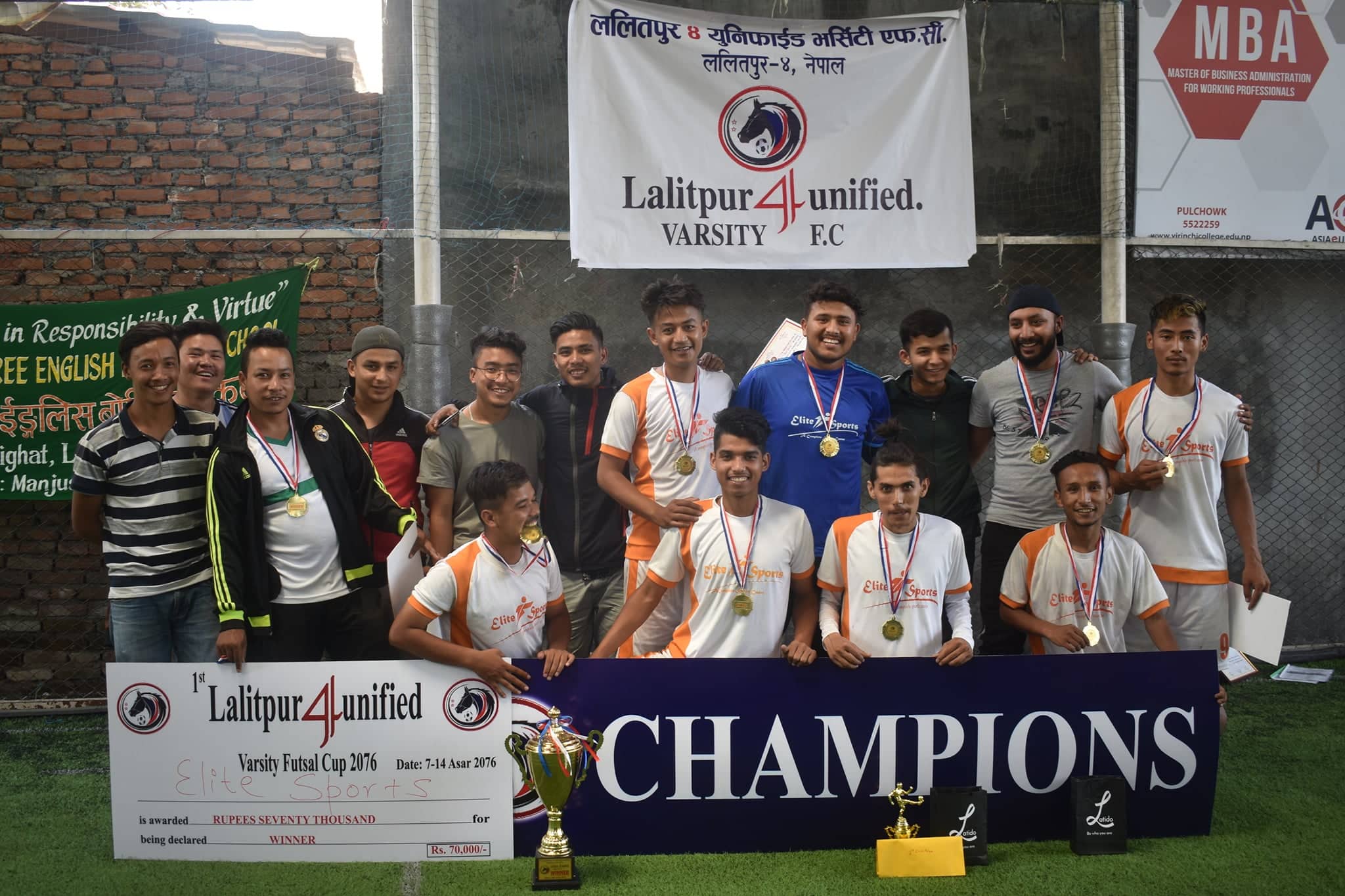 काठमाडौं (हाम्रो खेलकुद) – प्रथम ललितपुर ४ युनिफाइट भर्सिटी फुटसल कपको उपाधि इलाइट स्पोट्सले जितेको छ। धोविघाट फुटसलमा शनिबार भएको फाइनलमा ढुकु फुटसललाई १–० ले पराजित गर्दै उपाधि जितेको हो। उपाधिसँगै इलाइटले ७० हजार रुपैयाँ नगद पुरस्कार प्राप्त ग¥यो । उपविजेतामा सिमित भएपछि ढुकू ३० हजार रुपैयाँमा चित्त बुुझाउन बाध्य भयो । प्रतियोगिताको उत्कृष्ठ प्लेयर […]