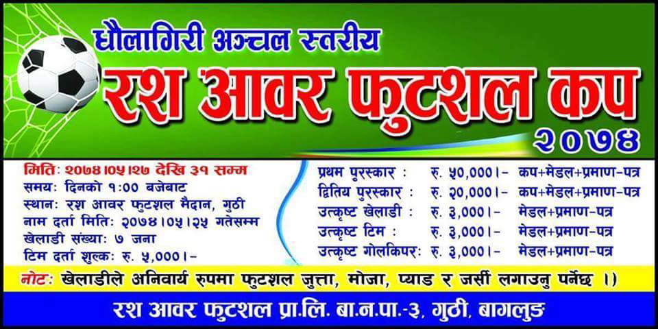 अर्जुन कार्की बागलुङ – बागलुङमा पहिलो पटक फुटसल प्रतियोगिता हुने भएको छ । बागलुङमा संचालनरत रश आवर फुटसल प्रा.लिको आयोजनामा भदौ २७ गते रश आवर फुटसल कप आयोजना हुन लागेको हो । बागलुङमा संचालनमा आएको फुटसलको प्रचारप्रसार र खेलाडी उत्पादन गर्ने उद्देश्यले धौलागिरी अञ्चल स्तरिय प्रतियोगिता गर्न लागिएको रश आवरका प्रोपाईटर राजु केसीले जानकारी […]