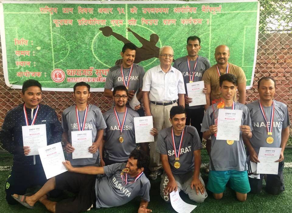 काठमाडौं (हाम्रो खेलकुद)– राष्ट्रिय धान दिवसको अवसरमा थापागाँउ सुधार समितिले आयोजना गरेको मैत्रीपूर्ण फुटसल टिम ‘ए’ ले जितेको छ । थापागाँउस्थित रोयल फुटसलमा आज भएको फाइनलमा टिम ‘ए’ ले टिम ‘बी’ लाई २–१ ले हराएको थियो । विजेता टोलीका लागि सम्राट केसी र दीपक थापाले गोल गरे । पराजित टोलीका लागि शशी थापाले गोल […]