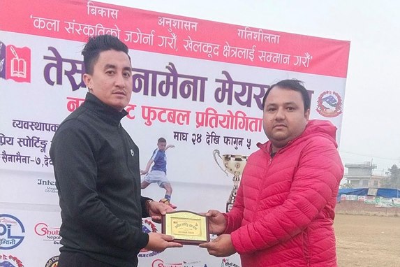 बुटवल (हाम्रो खेलकुद) – भैरव एफसी नवलपरासी रुपन्देहीको सैनामैना जारी तेस्रो मेयरकप फुटबल प्रतियोगिताको क्वाटरफाइनलमा प्रवेश गरेको छ । सोमबार भएको खेलमा भैरब एफसी नवलपरासीले चापाकोट युनाइटेडलाई २–१ ले पराजित गर्दै अन्तिम आठको यात्रा तय गरेको हो । सैनामैना नगरको आयोजना तथा जनप्रिय स्पोर्टिङ युवा क्लबको व्यवस्थापनमा स्थानीय सरस्वती माध्यमिक विद्यालयको खेलमैदानमा जारी प्रतियोगितामा भैरब […]