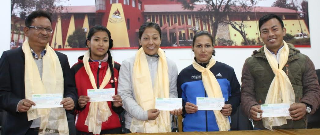 काठमाडौं (हाम्रो खेलकुद) – ओलम्पियन जुडोकी फुपुल्हामु खत्रीलाई नेपाल जुडो संघले मंगलबार २५ हजार रुपैयाँबाट पुरस्कृत गरेको छ । रियो ओलम्पिक– २०१६मा फुपुले महिला ६३ केजीमुनि तौलसमूहमा प्रतिस्पर्धा गरेकी थिइन् । उनले एक बाउट पूरा समय (४ मिनेट) टिकेर खेलेकोमा फुपुलाई पुरस्कृत गरेको हो । फुपुलाई एक बाउट पूरा समय टिकेको खण्डमा २५ हजार रुपैयाँबाट […]