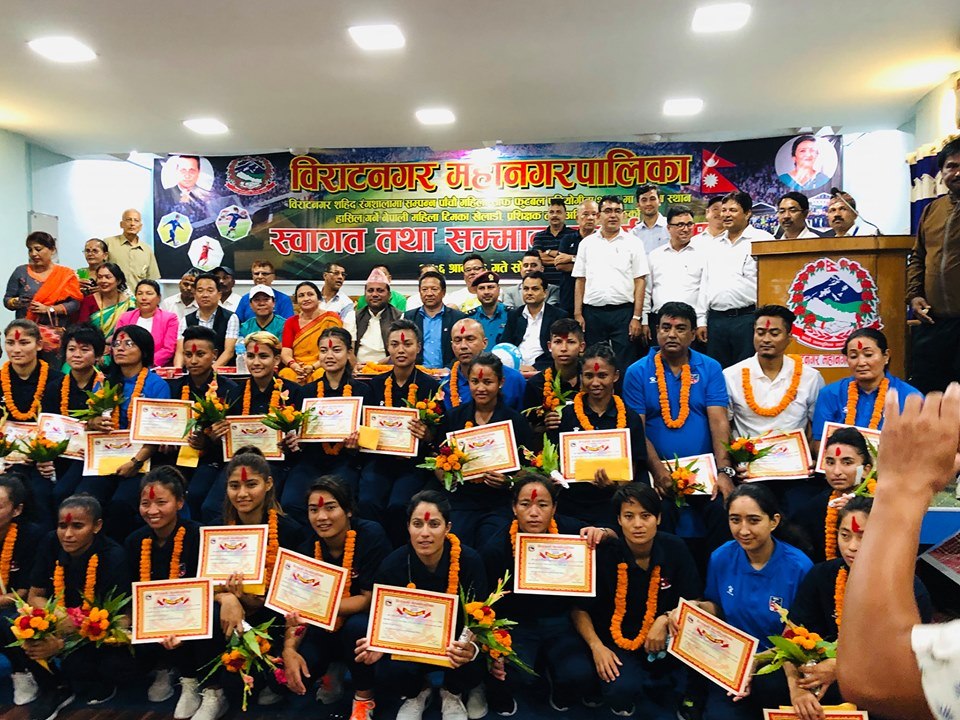 विराटनगर (हाम्रो खेलकुद)– विराटनगरमा सम्पन्न पाँचौं महिला साफ च्याम्पियनसिपको उपविजेता नेपाली महिला राष्ट्रिय फुटबल टोली सोमबार सम्मानित भएको छ । विराटनगर महानगरपालिकाले पुर्वघोषित निर्णयअनुसार साफको उपविजेता नेपाली महिला टोलीलाई जनही ५०–५० हजार रुपैयाले सम्मानित गरिएको हो ।। टिम तथा खेलाडीलाई विराटनगर महानगरपालिकाका मेयर भीम पराजुलीले नगदसहित सम्मानित गरे । साफको फाइनल दौरान महानगरले उपविजेता टोलीलाई […]