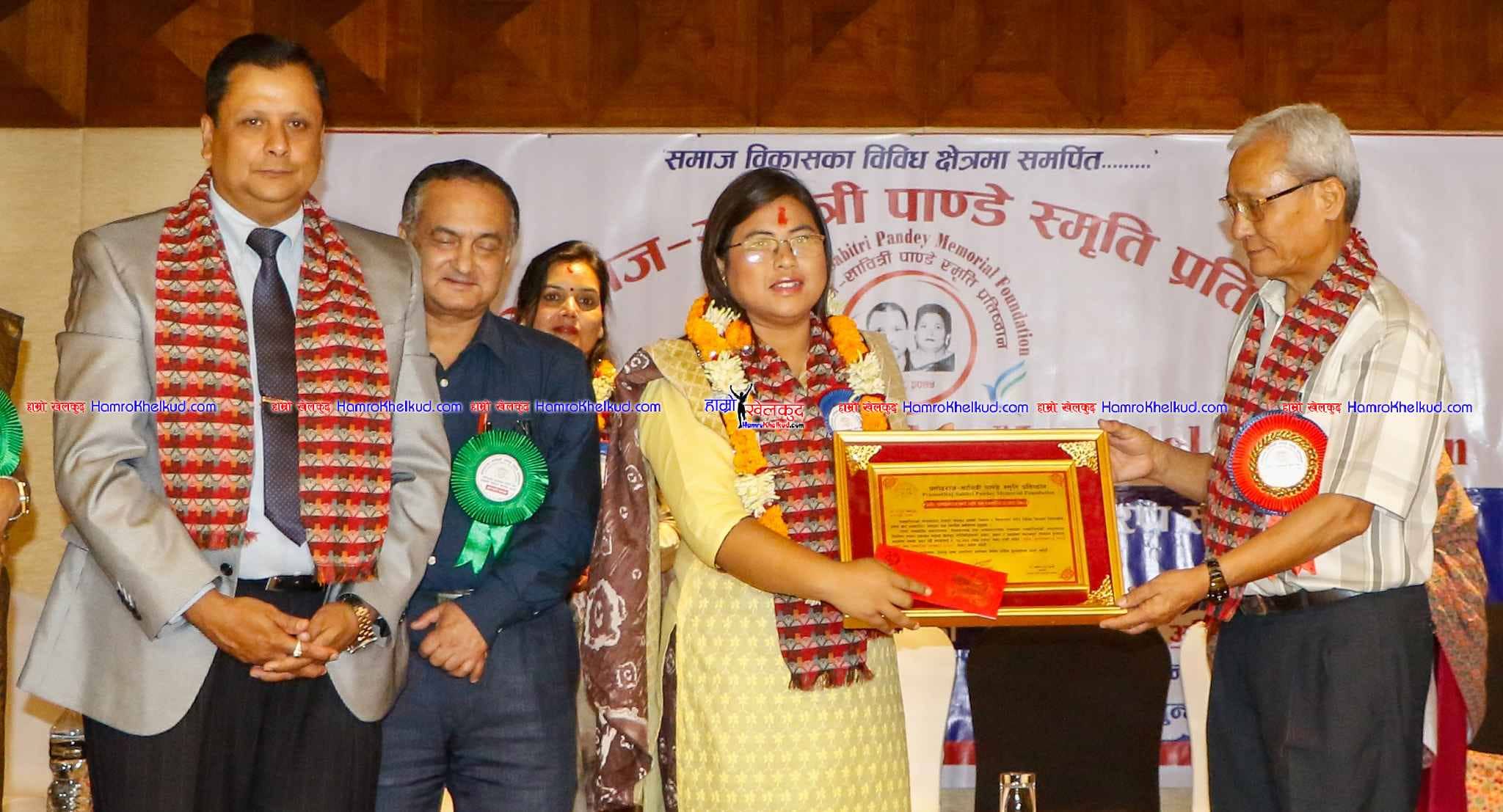 काठमाडौं (हाम्रो खेलकुद)– खेलकुद पत्रकार सरिता श्रेष्ठ र क्रिकेट खेलाडी कविता कुँवरलाई प्रमोदराज सावित्री पाण्डे स्मृति प्रतिष्ठानले शनिबार पुरस्कृत गरेको छ । राजधानीमा आयोजित कार्यक्रममा एभिन्यूज टेलिभिजनकी खेल पत्रकार श्रेष्ठलाई प्रमोद पुरुषोत्तमराज पाण्डे स्मृति खेल पत्रकारिता पुरस्कारबाट सम्मान गरेको हो । श्रेष्ठ डेढ दशकदेखि सक्रिय खेल पत्रकारिता गर्दै आएकी छिन् । प्रतिष्ठानले कवितालाई प्रमोद पुरुषोत्तमराज […]