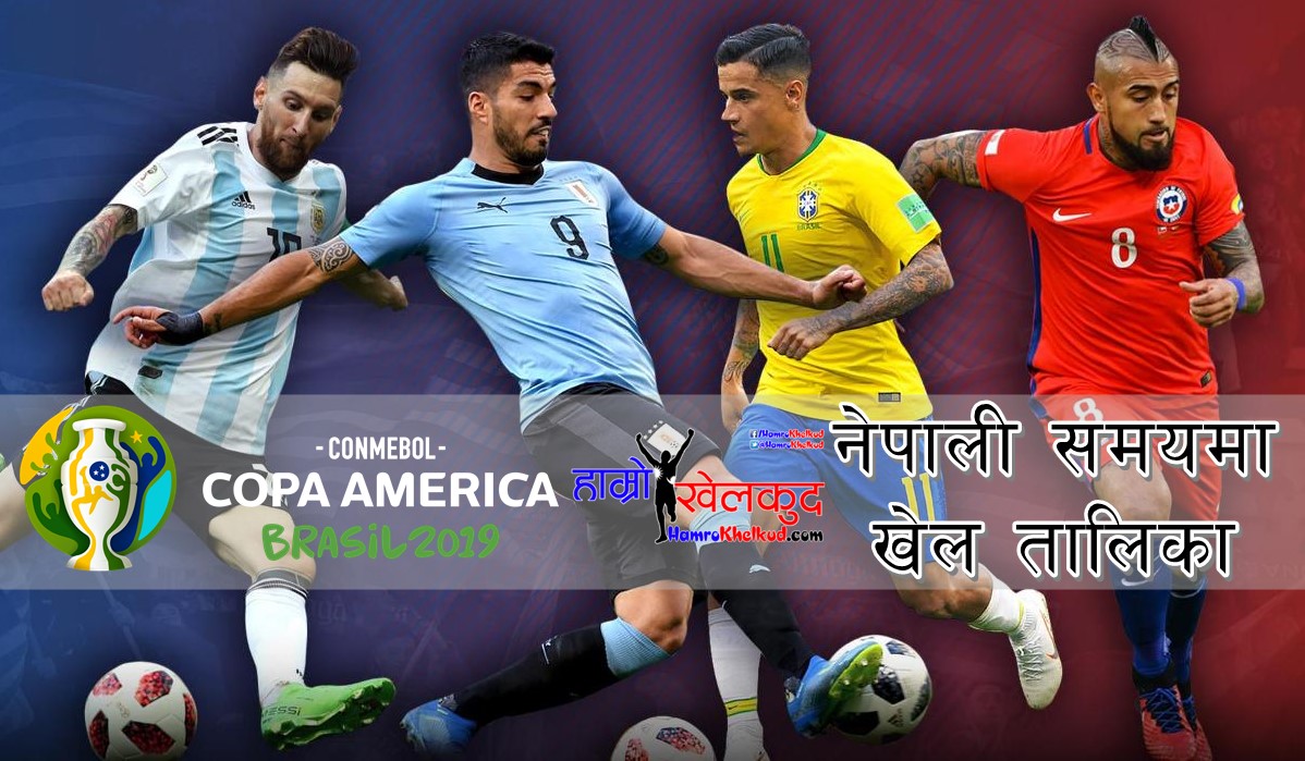कोपा अमेरिका २०१९खेल तालिका समूह ए : बोलिभिया, ब्राजिल, पेरु भेनेजुएलासमुह बी : अर्जेन्टिना, कोलोम्बिया, कतार, पाराग्वेसमूह सी : चिली, इक्वेडर, जापान, उरुग्वे समूह चरणको खेल तालिका:जेठ ३२, शनिबार – विहान ६:१५ बजे – ब्राजिल ३-० बोलिभियाअसार १ , आइतबार – मध्यरात १२:४५ बजे – भेनेजुएला ०-० पेरुअसार १, आइतबार – विहान ३:४५ बजे – […]