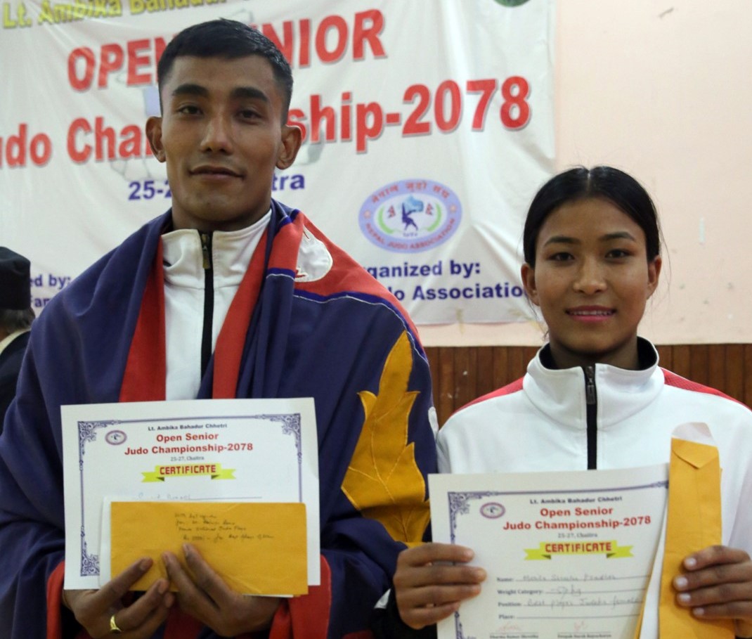 काठमाडौं (हाम्रो खेलकुद) – सन्जित डंगोल पुरुष र मनिता श्रेष्ठ प्रधान महिलामा अम्बिकाबहादुर क्षेत्री स्मृति राष्ट्रिय खुला जुडो प्रतियोगितामा आइतबार उत्कृष्ट खेलाडी घोषित भएका छन् । अघिल्लो दिन शनिबार सन्जितले ७३ केजीमुनि र मनीताले ५७ केजीमुनि स्वर्ण जितेका थिए । दुवै नेपाल प्रहरीका हुन् । प्रहरीकै राजबहादुर चन्द उत्कृष्ट प्रशिक्षक चुनिए । उत्कृष्ट खेलाडीलाई प्रतियोगिताको […]