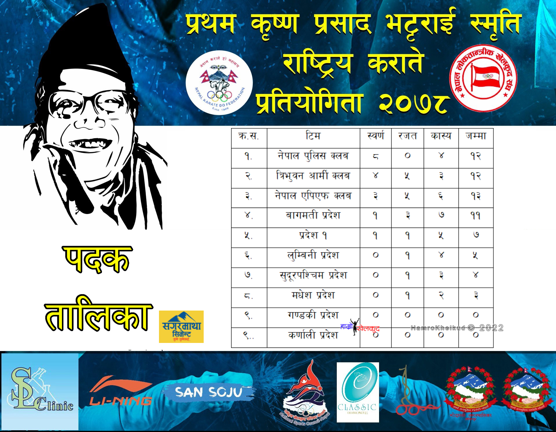काठमाडौं (हाम्रो खेलकुद) – नेपाल पुलिस क्लबकी सोनी राईले प्रथम कृष्णप्रसाद भट्टराई स्मृति राष्ट्रिय कराते प्रतियोगिताको महिला ५५ केजी तौल समूहमा स्वर्ण पदक जितेकी छन् । योसँगै पुलिसको स्वर्ण पदक संख्या ६ पुगेको छ । ललितपुर सातदोबाटोस्थित कराते हालमा जारी प्रतियोगिताको दोस्रो दिन शुक्रबार प्रदेश १ की विद्याकला राईलाई ८–६ ले हराउँदै सोनी च्याम्पियन बनेकी […]