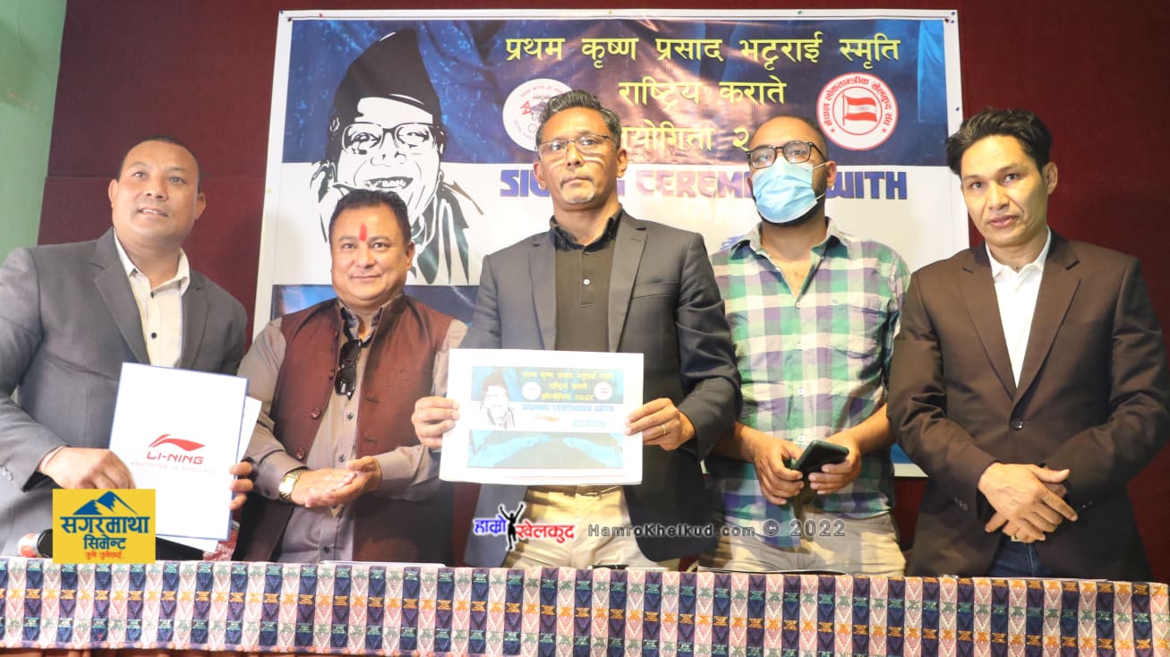 काठमाडौं (हाम्रो खेलकुद)– अर्को साता आयोजना हुने प्रथम कृष्ण प्रसाद भट्टराई स्मृति कराते प्रतियोगितालाई स्पोर्टस् र फेसनमा ख्याती प्राप्त लि निङ र कोरियन फास्ट फुड सम्पनी सान सोजु इसले सह प्रायोजन गरेका छन् । सम्झना ल्याब प्रतियोगिताको मुख्य प्रायोजक रहेको छ । लि निङका प्रबन्ध निर्देशक राजन महर्जन र सान सोजुका व्यवस्थापक शीशिर अर्याल तथा […]