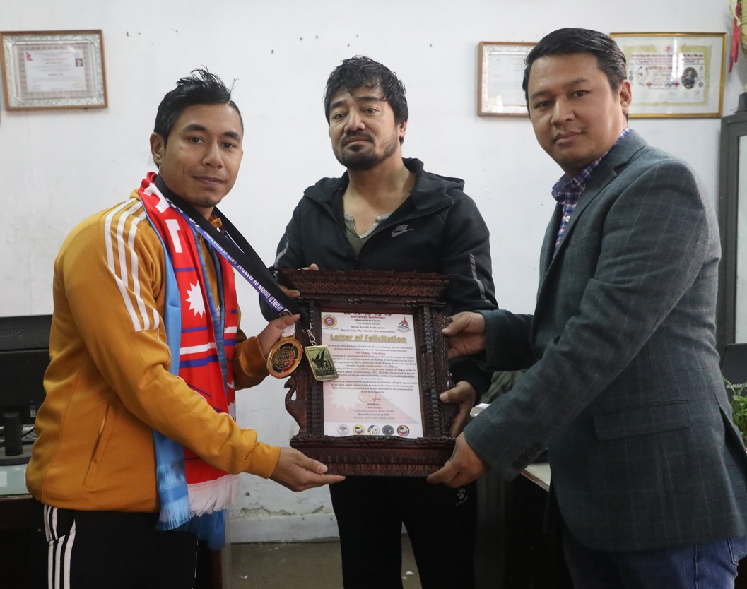 काठमाडौं (हाम्रो खेलकुद) – दुई फरक अन्तर्राष्ट्रिय अनलाइन कराते प्रतियोगिताका पदक विजेता खेलाडी सुमन तिमल्सिनालाई नेपाल गोजुरियो कराते डो संघले बुधबार सम्मान गरेको छ । नेपाल गोजुरियो कराते डो संघ एवं एसियाली गोजुरियो कराते महासंघका महासचिव बीआर मित्र र सागा एडभेन्चर टुर्स एन्ड ट्राभल्स प्रालि.का निर्देशक स्वच्छम गुरुङले सुमनलाई खादा र प्रशंसा पत्रसहित एक कार्यक्रमबीच […]