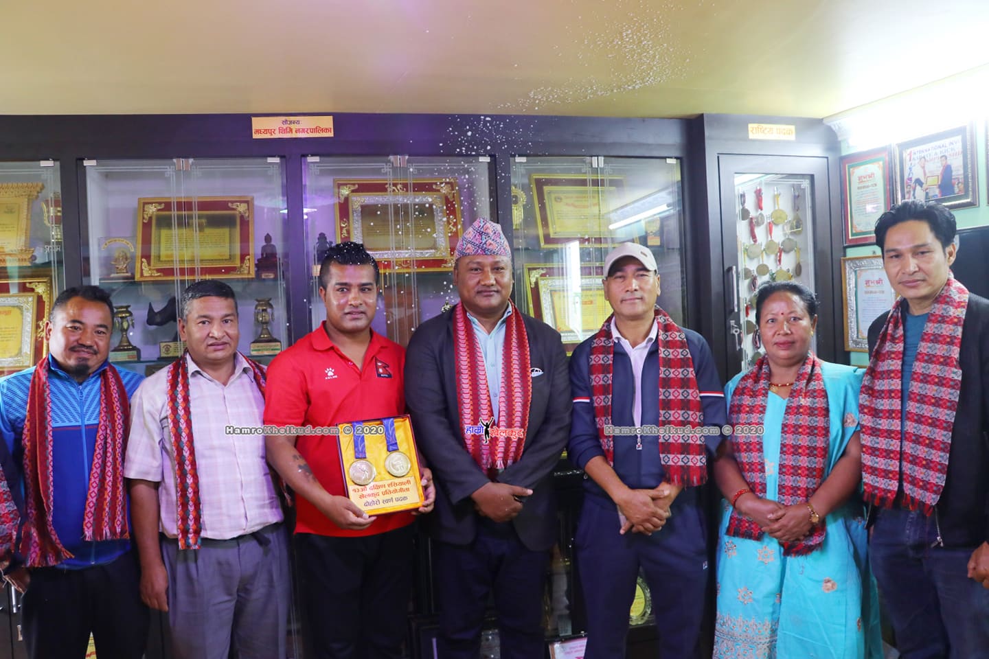 काठमाडौं (हाम्रो खेलकुद) – ललितपुरको गोदावरी नगरपालिकाले १३ औं दक्षिण एसियाली खेलकुद (साग) का पदक विजेता खेलाडी र प्रशिक्षकलाई नगदसहित सम्मान गरेको छ । नगरसभाका क्रममा बुधबार सागका पदक विजेता निकेश श्रेष्ठ र प्रशिक्षकद्वय दीपक श्रेष्ठ र गंगाराम महर्जनलाई नगदसहित सम्मान गरेको हो । उनीहरुलाई नगरपालिकका मेयर गजेन्द्र महर्जनले सम्मान गरेका थिए । गत वर्ष […]