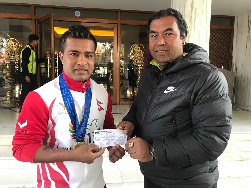 काठमाडौं (हाम्रो खेलकुद)– १३ औं दक्षिण एसियाली खेलकुद (साग) मा करातेका दोहोरो स्वर्ण पदक विजेता मण्डेकाजी श्रेष्ठलाई रुस्लान थ्री स्टार क्लबका कोषाध्यक्ष राम श्रेष्ठ बोसले पुरस्कृत गरेका छन् । देशका दुई स्वर्ण जितेको भन्दै श्रेष्ठले मण्डेकाजीलाई शुक्रबार प्रोत्साहन स्वरुप ५० हजार रुपैयाँबाट पुरस्कृत गरेका हुन् । उनले मण्डे बस्दै आएको होटल पुगेर चेक हस्तान्तरण गरेका […]
