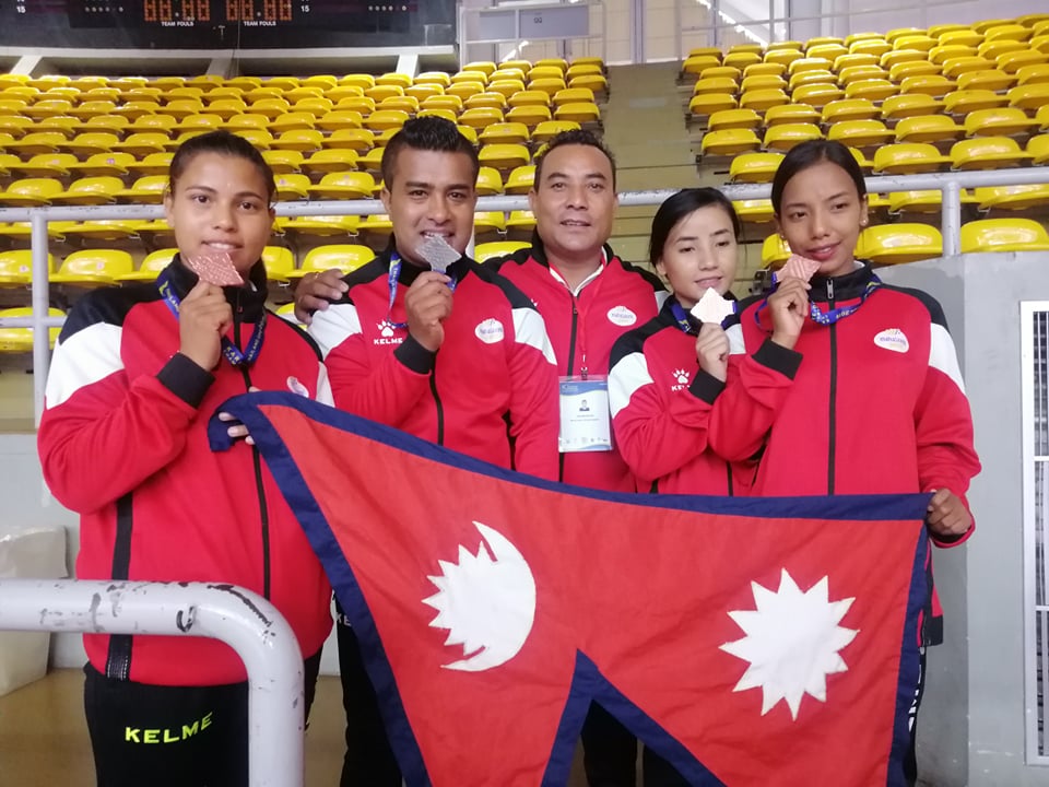 काठमाडौं (हाम्रो खेलकुद) – नवौं थाइल्याण्ड ओपन कराँते च्याम्पियनसिपमा एक स्वर्ण पदक, एक रजत र दुई कास्य पदक हासिल गरेका पदकधारी खेलाडीहरु सहित नेपाली कराते टोली बुधबार साँझ स्वदेश फर्किएको छ । थाइल्याण्डको बैंककस्थित इन्डोर स्टेडियम हौमार्कमा भएको खेलमा ४८ केजी मुनिको तौल समुहमा कुमुतेतर्फ सबिना श्रेष्ठले चीनकी खेलाडीलाई पराजित गरि नेपालको लागि स्वर्ण पदक […]