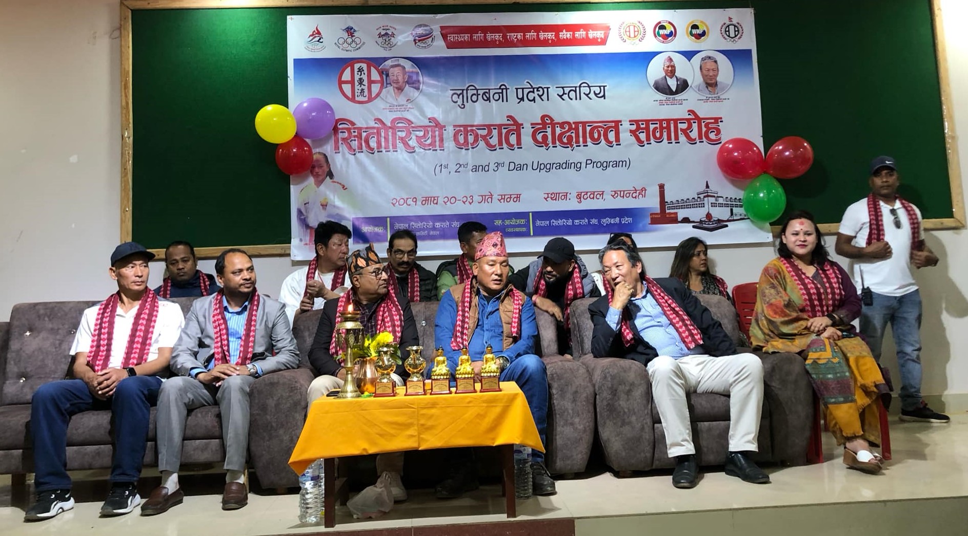 सुमन अधिकारी,बुटवल नेपाल सितेरियो कराते संघ, केन्द्रीय कमिटीको आयोजनामा सोमवार बुटवलमा ३ दिवशीय लुम्बिनी प्रदेशस्तरिय सितोरियो कराते दीक्षान्त समारोह सुभारम्भ गरिएको छ । आइतवारबाट सुरु गरिएको दीक्षान्त कार्यक्रमको उद्घाटन सोमवार गरिएको हो । कार्यक्रममा लुम्बिनी प्रदेशका ६ जिल्लाका करिव २ सय ५० कराते खेलाडीको सहभागिता थियो । दीक्षान्त कार्यक्रमलाई दुई चरणमा गर्ने योजनासहित पहिलो चरणमा […]