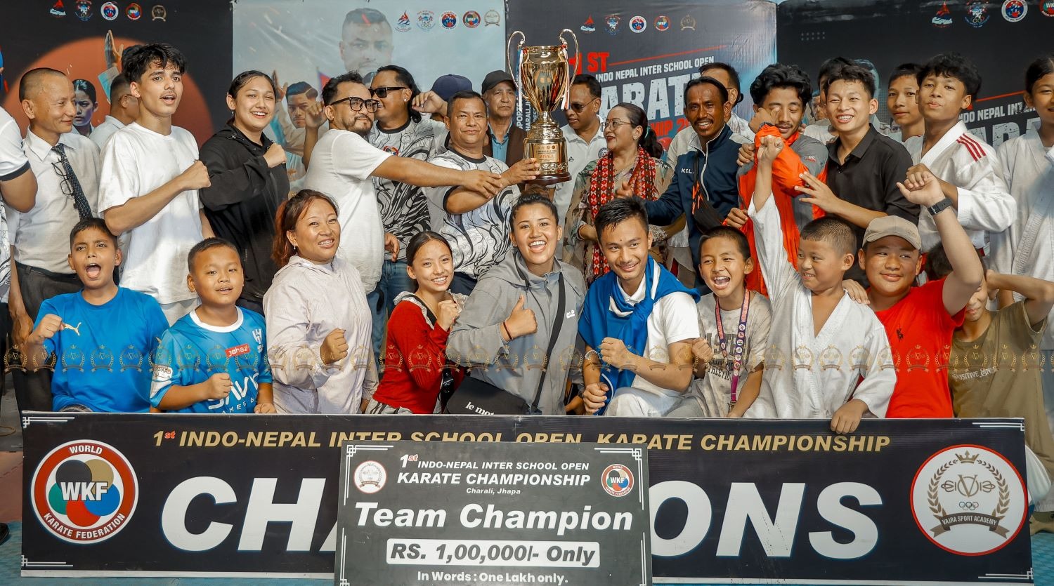 हिमाल खरेल, बिर्तामोड प्रथम इन्डो–नेपाल अन्तरविद्यालय खुला कराते च्याम्पियनसिपको उपाधि धरान रंगशाला कराते एकेडेमीले जितेको छ । धरानले ७५ वटा विद्यालयलाई पछि पार्दै उपाधि उचालेको हो । च्याम्पियनसिपको विजेता धरानले नगद नगद १ लाख रुपैयाँसहित आकर्षक ट्रफी, मेडल र प्रमाणपत्र प्राप्त गर्यो । धरान ३३ स्वर्ण जित्दै च्याम्पियन बनेको हो । धरानकै अर्को टिम धरान […]