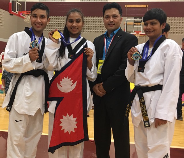 काठमाडौं (हाम्रो खेलकुद) – नेपाली राष्ट्रिय खेलाडी ज्ञानी चुनारा, यान कुमारी चौलागाईं र तारा कुमार रायमाझीले अमेरिकाको डालास टेक्सासमा भएको डालास अन्तर्राष्ट्रि तेक्वान्दो च्याम्पियनसिपमा स्वर्ण पदक जित्न सफल भएका छन् । शनिबार राति डालासमा सम्पन्न महिला फेदर वेट (५३–५७) केजी तौल समूहको फाइनलमा यान कुमारीले साल्भाडोरकी खेलाडीलाई पराजित गर्दै स्वर्ण जित्न सफल भएकी हुन् । […]