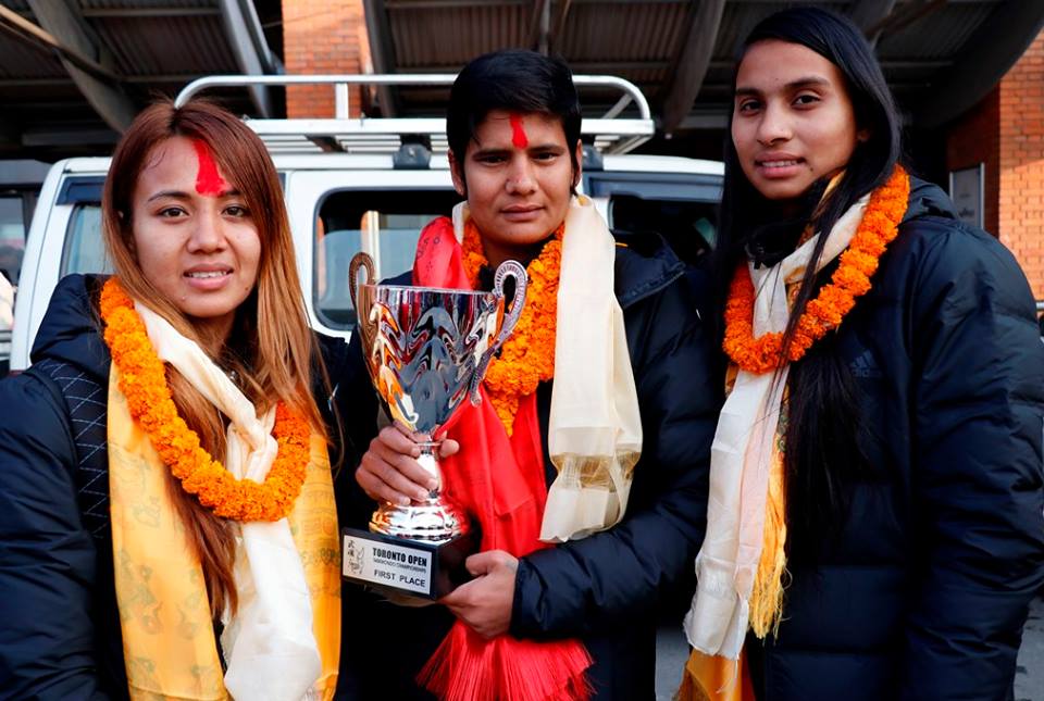 काठमाडौं (हाम्रो खेलकुद) – क्यानडामा भएको टोरन्टो ओपन तेक्वान्दो च्याम्पियनसिपमा स्वर्ण पदक विजेता यानकुमारी चौलागाईं सहितको नेपाली तेक्वान्दो टोली स्वदेश फर्किएको छ । यानसहित ज्ञानी चुनरा र रेजिना कार्की बुधबार स्वदेश फर्किएका हुन् । उनीहरुलाई त्रिभुवन अन्तर्राष्ट्रिय विमानस्थलमा नेपाल तेक्वान्दो संघका केन्द्रीय सदस्य हेमन्त डाँगी, पारा तेक्वान्दो प्रशिक्षक कल्याण कुँवर र नेपाल आर्मीका तेक्वान्दो खेलाडी […]