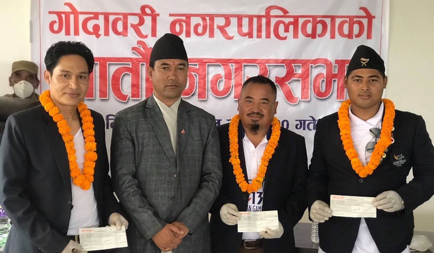 काठमाडौं (हाम्रो खेलकुद) – ललितपुरको गोदावरी नगरपालिकाले १३ औं दक्षिण एसियाली खेलकुद (साग) का पदक विजेता खेलाडी र प्रशिक्षकलाई नगदसहित सम्मान गरेको छ । नगरसभाका क्रममा बुधबार सागका पदक विजेता निकेश श्रेष्ठ र प्रशिक्षकद्वय दीपक श्रेष्ठ र गंगाराम महर्जनलाई नगदसहित सम्मान गरेको हो । उनीहरुलाई नगरपालिकका मेयर गजेन्द्र महर्जनले सम्मान गरेका थिए । गत वर्ष […]