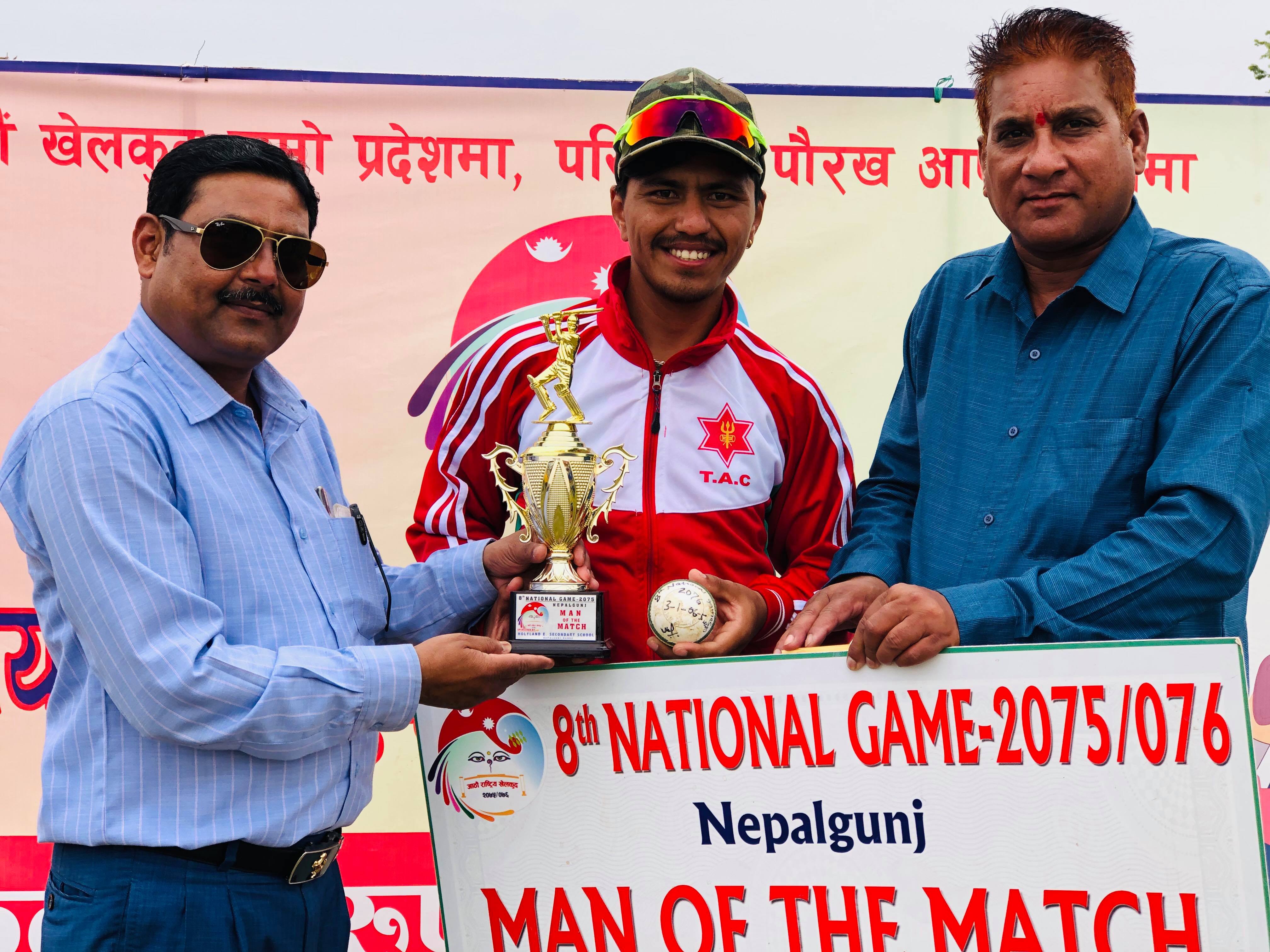 नेपालगञ्ज (हाम्रो खेलकुद) – त्रिभुवन आर्मी क्लवले नेपालगञ्जमा जारी आठौं राष्ट्रिय खेलकुद अन्तर्गत पुरुष क्रिकेटमा कास्य पदक जितेको छ । बुधबार भएको खेलमा आर्मीले प्रदेश नम्बर १ लाई ६९ रनले पराजित गर्दै कास्य पदक जित्न सफल भयो । कोहलपुर क्रिकेट मैदानमा टस जितेर पहिला ब्याटिङ थालेको आर्मीले निर्धारित २० ओभरमा ७ विकेटको क्षतिमा कुल १ […]