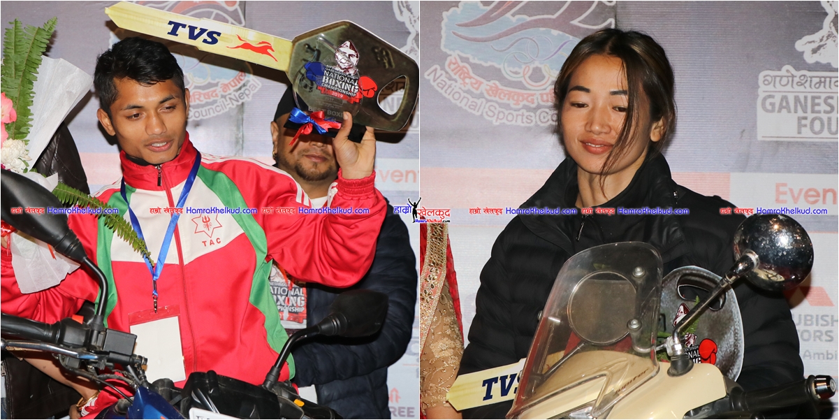 काठमाडौं (हाम्रो खेलकुद) – त्रिभुवन आर्मी क्लबका सुशील थापा र नेपाल पुलिस क्लबकी दिवाना शेर्मा वीर गणेशमान राष्ट्रिय बक्सिङ च्याम्पियनसिप २०१९ को सर्वोत्कृष्ट खेलाडी घोषित भएका छन् । यससँगै सुशीलले मोटरसाइकल र दिवानाले स्कुटर प्राप्त गरेका छन् । वीर गणेशमान फाउन्डेसनको आयोजनामा वसन्तपुर डबलीमा आयोजित प्रतियोगिताको अन्तिम दिन त्रिभुवन आर्मी पुरुषतर्फ पनि टिम च्याम्पियन बन्यो […]
