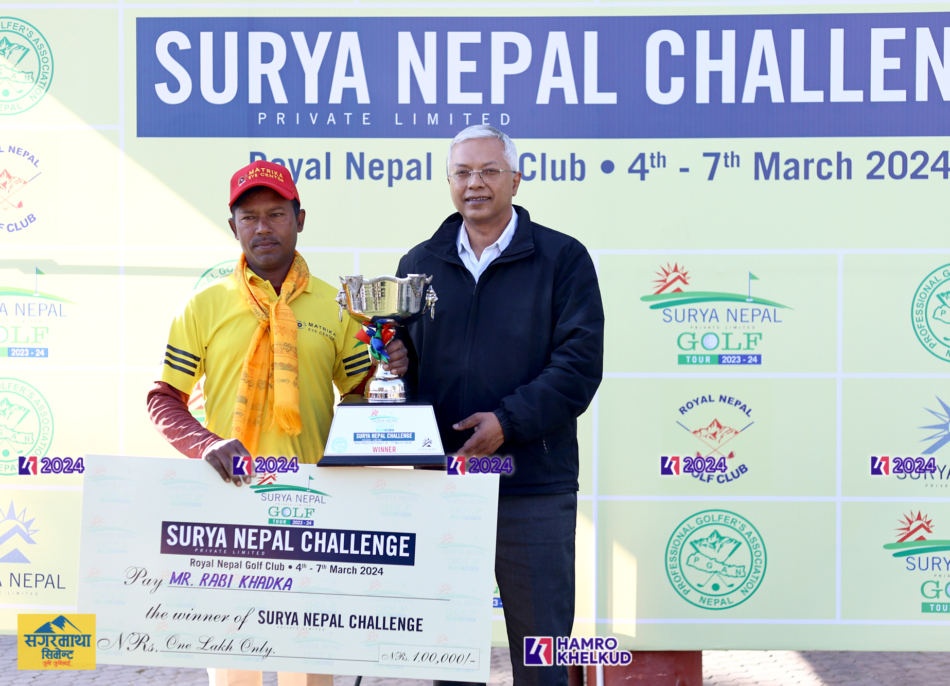 काठमाडौं (हाम्रो खेलकुद)- पूर्व नम्बर एक गल्फर रवि खड्काले सूर्य नेपाल गल्फ टुर २०२३-२४ अन्तर्गतको पाँचौं प्रतियोगिताका रुपमा रहेको सूर्य नेपाल च्यालेन्जको उपाधि जितेका छन्। साविक विजेता एमेच्योर सदभाव आचार्यलाई ७ स्ट्रोकको फराकिलो अन्तरमा हराउँदै रविले उपाधि जितेका छन्। रविले सात वर्षपछि करियरको पहिलो उपाधि जितेका हुन। सन् २०१७ को अप्रिलमा सूर्य नेपाल एनपीजीए म्याच […]
