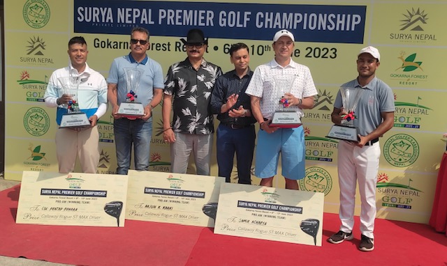 काठमाडौं (हाम्रो खेलकुद) – सूर्य नेपाल गल्फ टुर २०२२-२३ अन्तर्गत अन्तिम प्रतियोगिता, सूर्य नेपाल प्रिमियर गल्फ च्याम्पियनसिपको प्रो-एमको उपाधि व्यवसायिक गल्फर दिनेश प्रजापति र टिमले हात पारेको छ। गोकर्ण गल्फ क्लबमा आयोजित प्रतियोगितामा दिनेशसहित एमेच्योर खेलाडीहरू समिर आचार्य, कर्णेल प्रताप बोहरा र अर्जुन कुमार कार्कीको टिमले १६२ अंक सहित उपाधि जितेको हो। दिनेश र समिरले […]