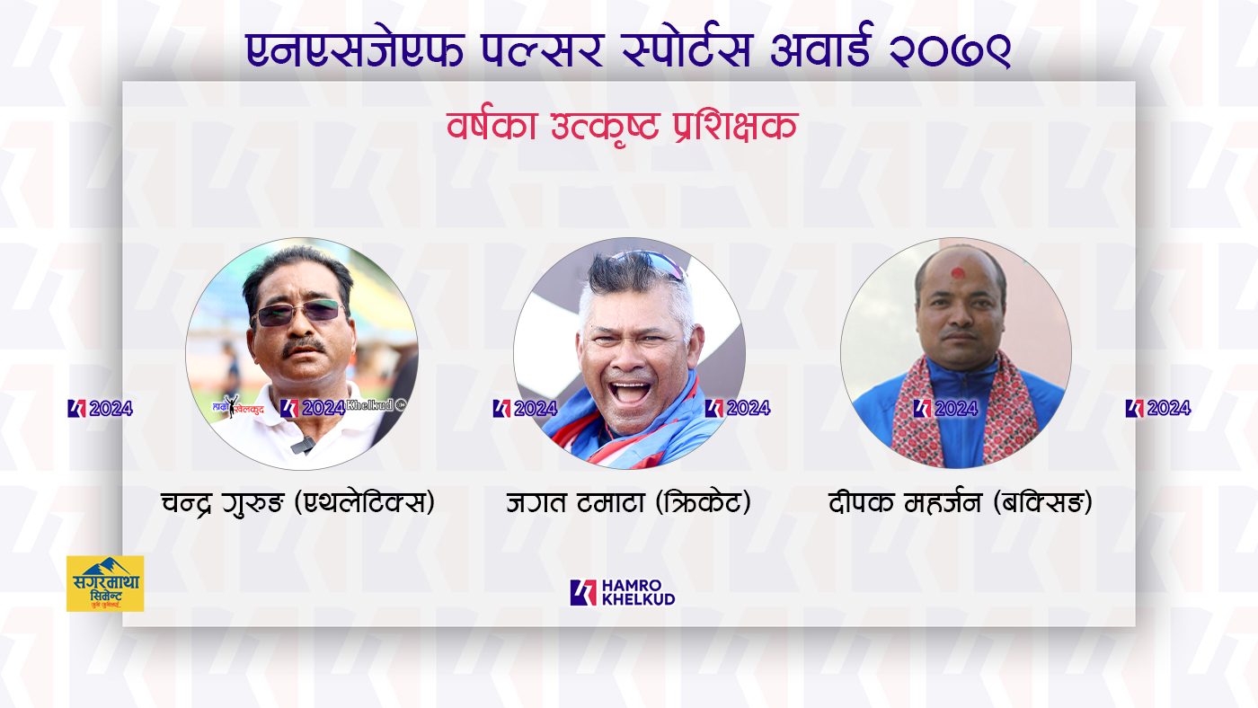 काठमाडौं (हाम्रो खेलकुद) – एनएसजेएफ पल्सर स्पोर्टस अवार्ड २०७९ को वर्ष उत्कृष्ट प्रशिक्षकको अन्तिम मनोनयन सार्वजनिक भएको छ । नेपाल खेलकुद पत्रकार मन्चले माघ २८ गते आयोजना गर्ने अवार्डको शुक्रबार ४ व्यक्तिगत विधातर्फ ३ खेलाडी समेट्दै अन्तिम मनोनयन सार्वजनिक गरेको हो । यसपटक पहिलो चरणमा ४ विधाका समान ८ जनालाई मनोनयनमा राखिएको थियो । वर्षका […]