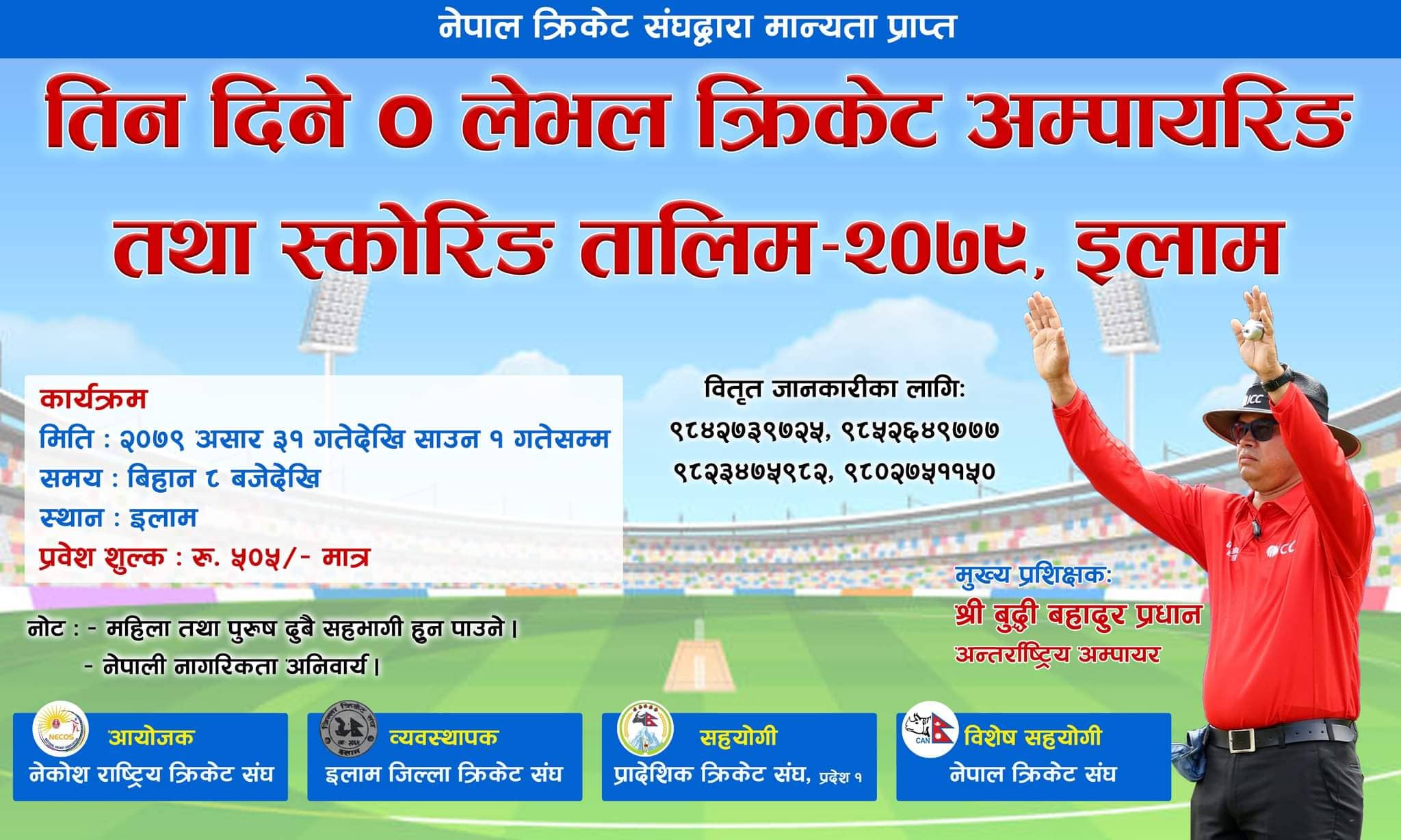 काठमाडौं (हाम्रो खेलकुद) – नेकोस राष्ट्रिय क्रिकेट संघले अम्पायरिङ र स्कोरिङ तालिम आयोजना गर्ने भएको छ । ईलाममा आयोजना हुने तालिम असार ३१ देखी साउन १ गतेसम्म चल्नेछ । तालिमको मुख्य प्रशिक्षकमा अन्तराष्ट्रिय अम्पायर बुद्धि बहादुर प्रधान रहेको संघका अध्यक्ष बिप्लभ घोषले जनाएका छन । अध्यक्षका अनुसार तालिममा नेपाली महिला तथा पुरुषले सहभागिता जनाउन पाउने […]