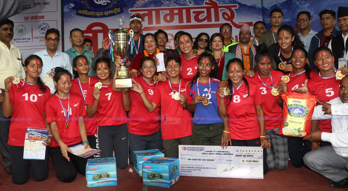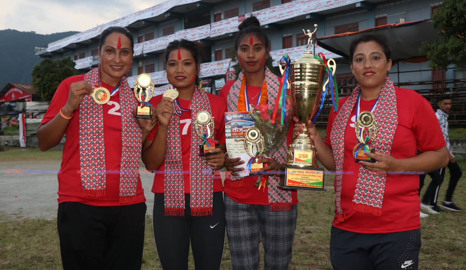 पोखरा (हाम्रो खेलकुद)– नेपाल पुलिस क्लबले पहिलो पटक तीज महोत्सव राष्ट्रिय महिला भलिबल प्रतियोगिताको च्याम्पियन बन्दा व्यक्तिगत पुरस्कारमा पनि दबदबा राखेको छ । प्रतियोगिताका ७ व्यक्तिगत पुरस्कार मध्यये ४ पुरस्कार पुलिसका खेलाडीले जिते । तीन दिने प्रतियोगितामा पुलिसकी मनीषा चौधरी सर्वोत्कृष्ट खेलाडीबाट पुरस्कृत भइन् । उनले ५ हजार रुपैयाँ हात पारिन् । त्यस्तै पुलिसकी सुशिला […]
