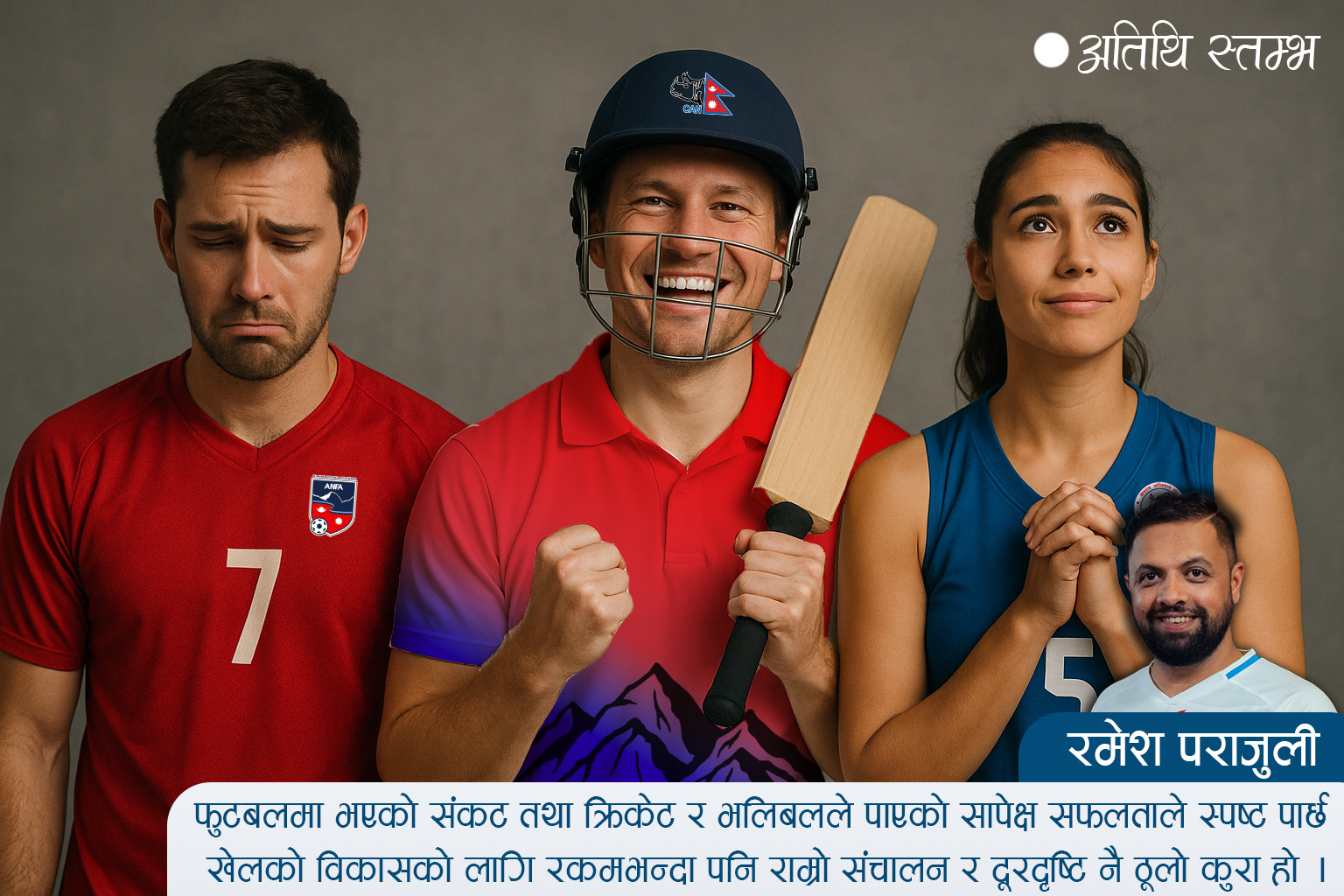 रमेश पराजुली काठमाडौं – नेपाली खेलकुदको परिदृश्य आज एउटा विचित्र विरोधाभासबिच बाँधिएको छ । एकातर्फ ठूला आर्थिक स्रोत र सम्भावनाले भरिपूर भएपनि संरचनात्मक कमजोरी, व्यवस्थित व्यवस्थापनको अभाव र दीर्घकालीन दृष्टिकोण नहुँदा लगातार पतनको मार्गमा अगाडि बढिरहेको फुटबल छ । अनि अर्कोतिर सीमित साधनका बाबजुद व्यवस्थित योजना, पारदर्शिता र उत्साही प्रशंसकको कारण अन्तर्राष्ट्रिय स्तरमा आफ्नो पहिचान […]