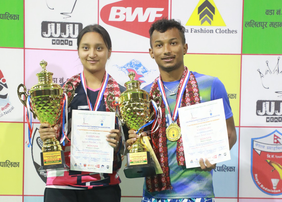 ललितपुर (हाम्रो खेलकुद) – राष्ट्रिय च्याम्पियनद्धय नेपाल पुलिस क्लबका प्रिन्स दाहाल र विभागीय त्रिभुवन आर्मी क्लबकी रशिला महर्जनले प्रथम ललितपुर मेयर कप राष्ट्रिय ब्याडमिन्टन प्रतियोगिताको उपाधि जितेका छन् । प्रिन्स पुरुष एकलतर्फ तथा रशिला महिला एकलमा च्याम्पियन बनेकी हुन् । यि दुवै गत कात्तिकमा गण्डकी प्रदेशको पोखरामा सम्पन्न नवौं राष्ट्रिय खेलकुदमा पनि च्याम्पियन बनेका थिए […]
