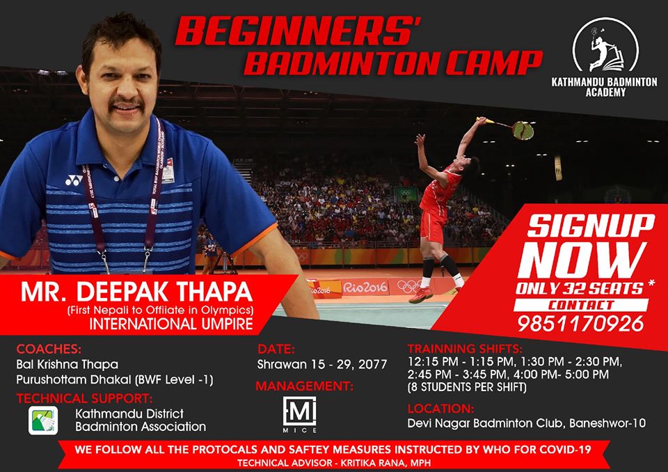 काठमाडौं (हाम्रो खेलकुद) – गत चैतमा नेपाली ब्याडमिन्टन टोलीलाई प्रशिक्षण दिन आएका कोरियन प्रशिक्षक चोइ सिउन कुकले वरीयताका खेलाडीसँगै जुनियर टोलीलाई पनि प्रशिक्षण दिन थालेका छन् । प्रशिक्षक कुकले सोमबारदेखि वरीयताका खेलाडीसँगै जुनियर टोलीलाई पनि प्रशिक्षणको समय छुट्याएका हुन् । नेपालमा लकडाउन खुकुलो भएसँगै नेपाल ब्याडमिन्टन संघले राष्ट्रिय खेलकुद परिषदको स्वीकृति लिई असार दोस्रो सातादेखि […]