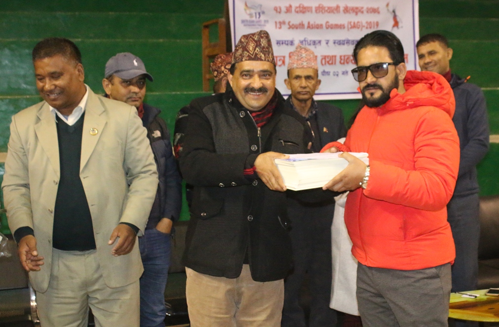 काठमाडौं (हाम्रो खेलकुद) – १३ अौं दक्षिण एसियाली खेलकुद (साग) अन्तर्गत गल्फमा दोहोरो स्वर्ण पदक जितेका सुवास तामाङ र कास्य पदक विजेता रविना श्रेष्ठ सम्मानित भएका छन् । ललितपुरको कोन्ज्योसोम गाउँपालिकाले दुवै खेलाडीलाई नगदसहित सम्मान गरेको हो । दुवै खेलाडी कोन्ज्योसोम गाउँपालिका वडा नम्बर ५ का बासिन्दा हुन् । सम्मान कार्यक्रममा सुवासले १ लाख रुपैयाँ […]