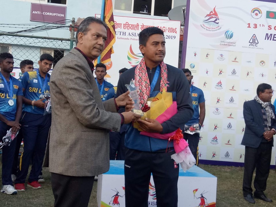 काठमाडौं (हाम्रो खेलकुद) – राष्ट्रिय क्रिकेट टोलीका कप्तान ज्ञानेन्द्र मल्ल १३ औं दक्षिण एसियाली खेलकुद (साग) पुरुष टि ट्वान्टी क्रिकेट प्रतियोगिताको उत्कृष्ट ब्याट्सम्यान घोषित भएका छन् । प्रतियोगिताभर ५ खेलमा २ सय १२ रन बनाएका ज्ञानेन्द्रले श्रीलंका र बंगलादेशका टेष्ट खेलाडीलाई पछि पर्दै उत्कृष्ट ब्याट्सम्यान चुनिए । ज्ञानेन्द्रले श्रीलंका यू२३ विरुद्ध २१, भुटानविरुद्ध १ सय […]