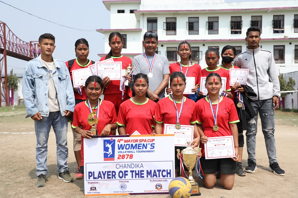 धनगढी (हाम्रा खेलकुद) – टिकापुर बहुमुखी क्याम्पसले चौथो मेयर एसपिए कप महिला भलिबल प्रतियोगिताको उपाधि जितेको छ । आयोजक सुदूरपश्चिमाञ्चल क्याम्पसलाई पराजित गर्दै टिकापुरले उपाधि जितेको हो । उपाधिसँगै टिकापुर बहुमुखी क्याम्पसले ५० हजार रुपैयाँ नगद पुरस्कार पाएको छ । उपविजेता सुदूरपश्चिमाञ्चल क्याम्पसले २५ हजार पाएको छ । कान्तिराज्यलक्ष्मी मावि पहलमानपुरलाई हराएर अत्तरियाको दुर्गालक्ष्मी तेस्रो […]