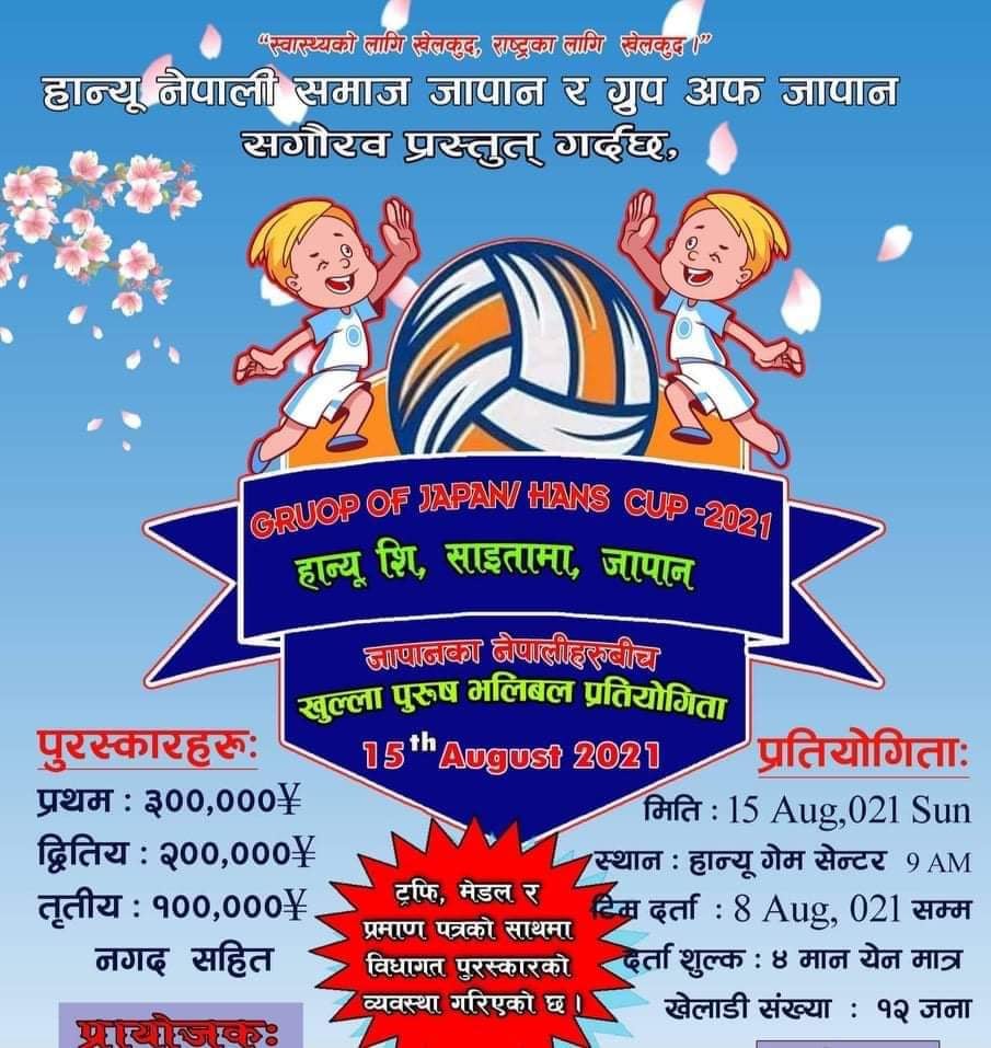 काठमाडौं (हाम्रो खेलकुद) – हान्यु नेपाली समाज जापान र ग्रुप अफ जापानको संयुक्त आयोजनामा जापानमा रहेका नेपालीबीच ‘ग्रुप अफ जापान हान्स कप –२०२१’ खुल्ला पुरुष भलिवल प्रतियोगिता आयोजना हुने भएको छ । प्रतियोगिता हान्यु शि साईतामा केनमा रहेको हान्यु गेम सेन्टरमा १५ अगष्टदेखि शुरु हुनेछ । प्रतियोगिताको विजेता टोलीले ३ लाख जापानी येन प्राप्त गर्नेछन् […]