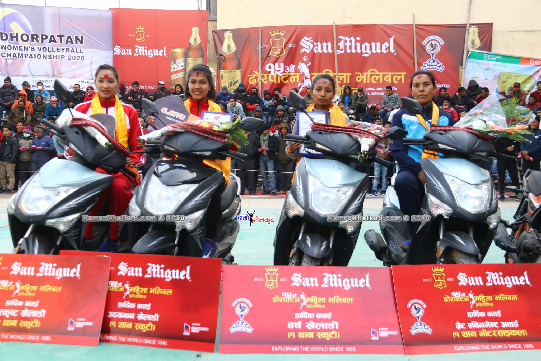 काठमाडौं (हाम्रो खेलकुद)– ढोरपाटन महिला डबल लिग भलिबल प्रतियोगितामा चार अलग क्लबका खेलाडीले स्कुटर प्राप्त गरेका छन् । राष्ट्रिय महिला भलिबल टोलीकी पूर्व कप्तान समेत रहेकी ढोरपाटन लिग च्याम्पियन नेपाल एपिएफकी कप्तान विनिता बुढाथोकी ग्रेट अचिभमेन्ट अवार्ड प्राप्त गरिन् । राष्ट्रिय टोलीका तीन सदस्य त्रिभुवन आर्मी क्लबकी सफिया पुन सर्वोत्कृष्ट खेलाडी, होंगान्जी न्यू डायमण्ड एकेडेमीकी […]