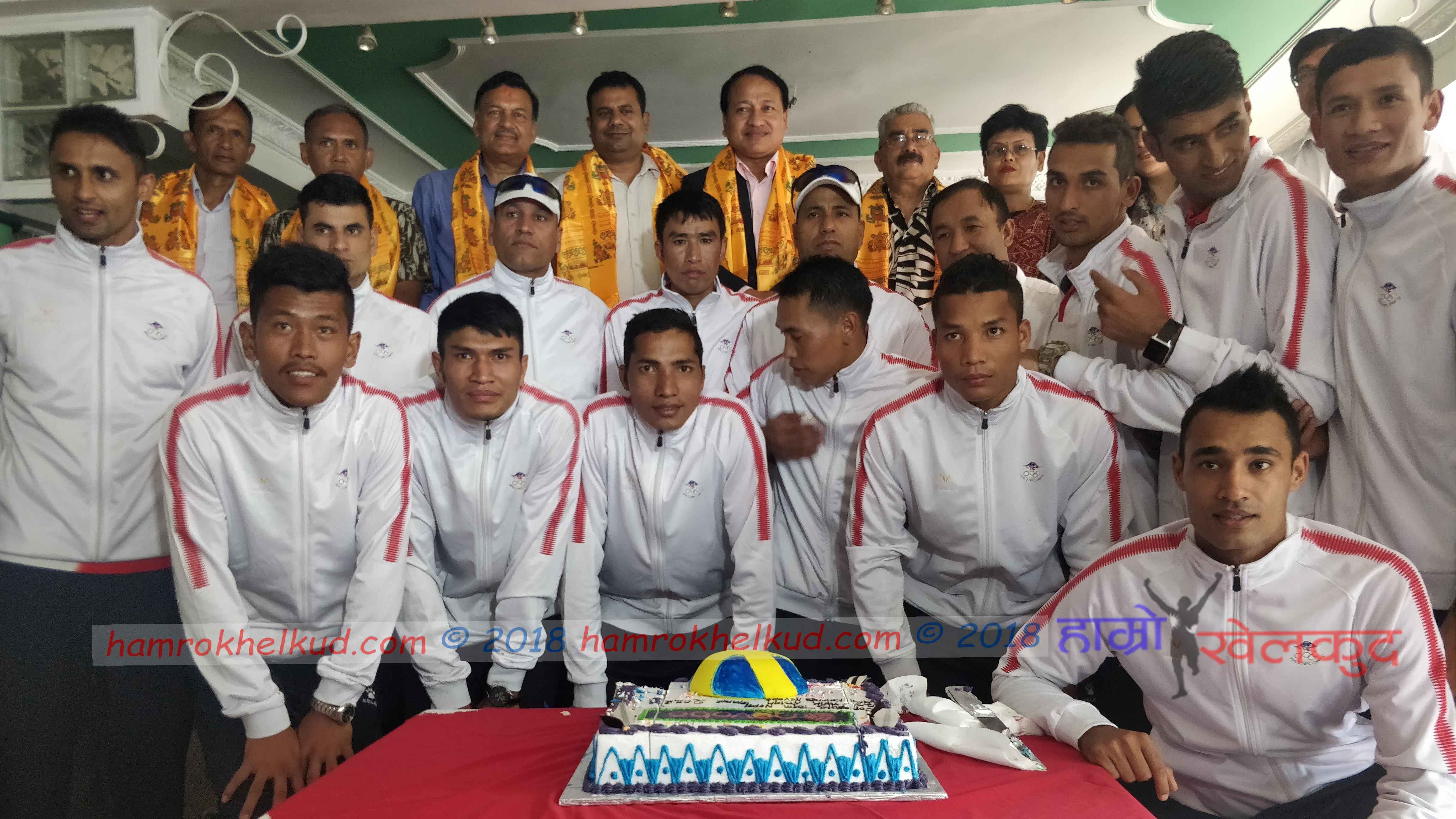 काठमाडौं (हाम्रो खेलकुद) – एसियाली खेलकुदमा १५ अौं स्थान हासिल गरेको नेपाली पुरुष भलिबल टोलीलाई नेपाल भलिबल संघ (एनभीए) ले अाइतबार राजधानीमा सम्मान गरेको छ । सम्मान कार्यक्रममा टोलीका खेलाडी र प्रशिक्षकसँगै संघका पदाधिकारीले केक काटे । संघले प्रत्यक खेलाडीेलाई १० हजार रुपैयाँले सम्मान गर्यो । एसियाली खेलकुदमा हासिल गरेको सफलताले दक्षिण एसियाली खेलकुदमा थप […]