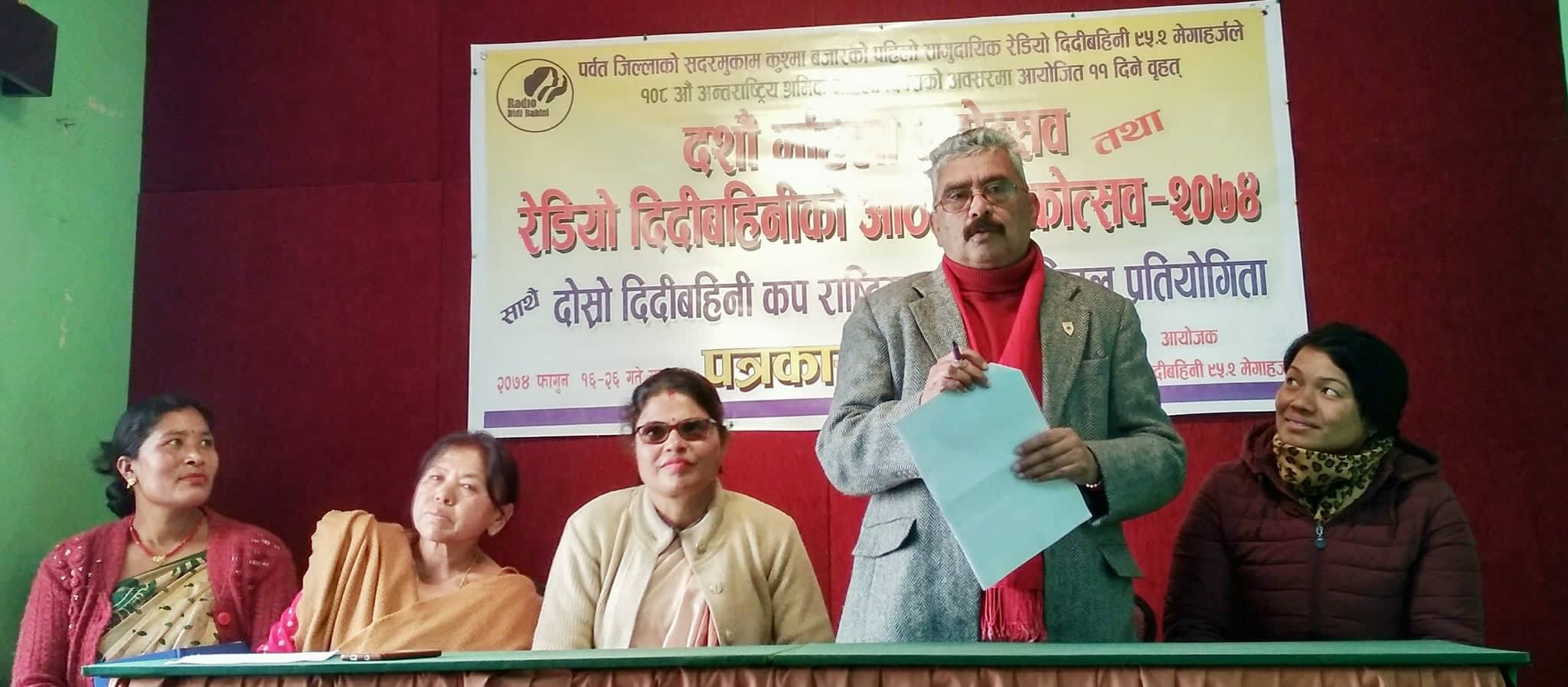 काठमाडौं (हाम्रो खेलकुद) – दोस्रो संस्करणको दिदी बहिनी कप राष्ट्रिय महिला भलिबल फागुनमा हुने भएको छ । पर्वतको सदरमुकाम कुश्मामा रहेको रेडियो दिदी बहिनीको आठौं वार्षिकोत्सवको अवसर पारेर दोस्रो संस्करणको दिदी बहिनी कप राष्ट्रिय महिला भलिबल फागुन २२ देखि २४ गतेसम्म आयोजना गर्न लागिएको रेडियोका अध्यक्ष कल्पना चापागाईंले पत्रकार सम्मेलनमार्फत बिहिबार जानकारी गराइन् । त्यसअघि […]