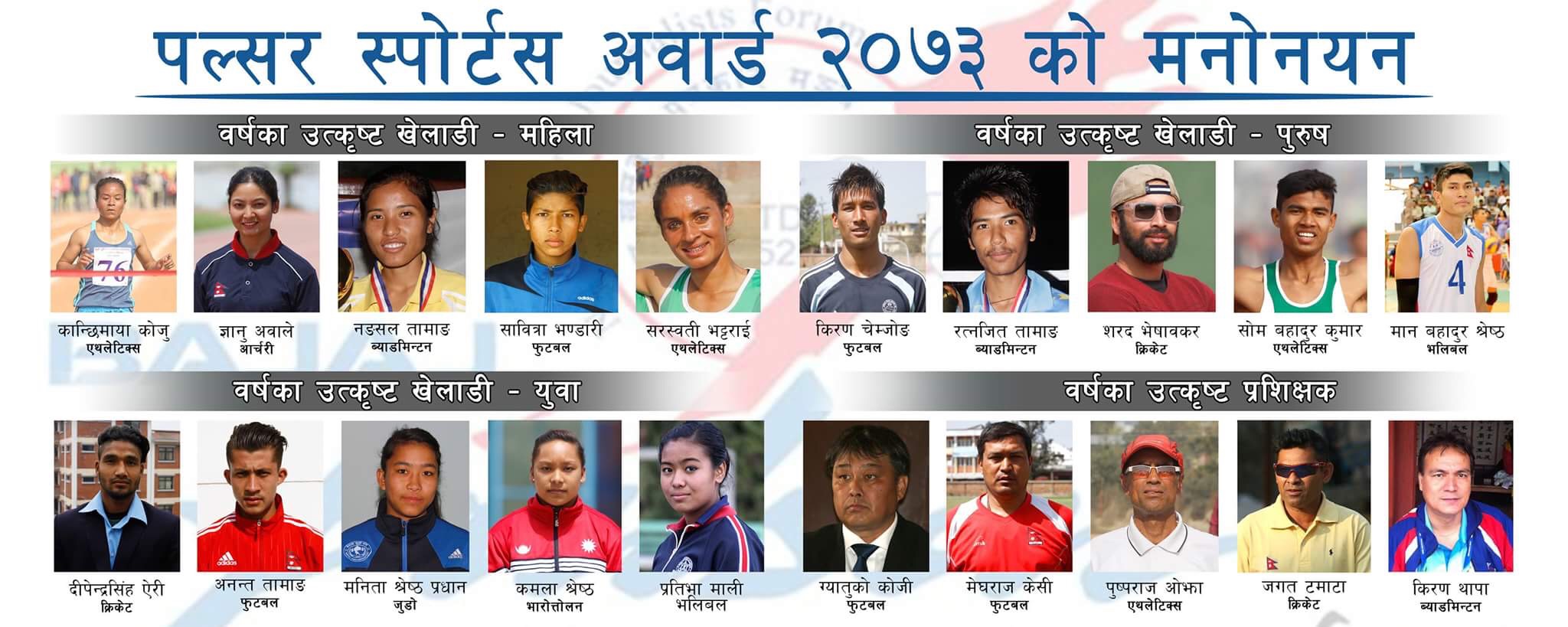 काठमाडौं (हाम्रो खेलकुद)– पल्सर स्पोर्टस अवार्ड २०७३ को आज मनोनयन सार्वजनिक हुँदा सबैभन्दा बढी फुटबलबाट मनोनयनमा पर्न सफल भएका छन् । मनोयनमा ८ खेलका २० जना समेटिदा फुटबलका मात्र ५ जना परेका छन् । चारै विधामा फुटबल खेलाडी, प्रशिक्षक पर्न सफल भएका छन् । राष्ट्रिय फुटबल टोलीका गोलकिपर किरण चेम्जोङ बर्षको उत्कृष्ट पुरुष खेलाडीको मनोनयनमा […]