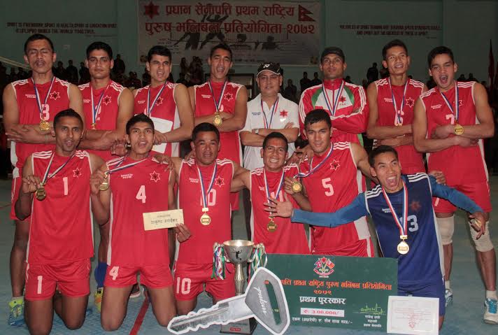 काठमाडौं, फागुन १५ आयोजक त्रिभुवन आर्मी क्लबको ए टिमले ‘प्रधानसेनापति प्रथम राष्ट्रिय पुरुष भलिबल प्रतियोगिता २०७२’ को उपाधि हात पारेको छ । शुक्रबार लगनखेलस्थित आर्मीको सैनिक तालिम केन्द्रमा भएको खेलमा अर्काे विभागीय क्लब नेपाल पुलिस क्लबलाई ३–० को सोझो सेटमा पराजित गर्दै आर्मीले उपाधि हात पारेको हो । आर्मीकै बी टिमले तेस्रो स्थान हात पा¥यो […]
