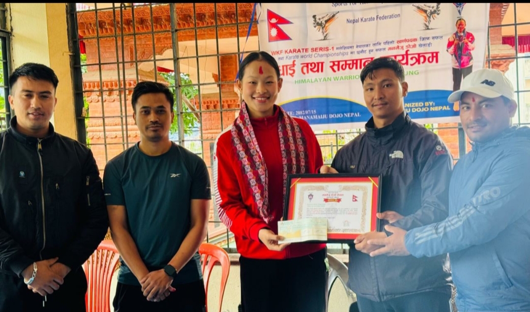काठमाडौं (हाम्रो खेलकुद)- नेपाली राष्ट्रिय कराते खेलाडी एरिका गुरुङ शनिबार सम्मानित भएकी छिन् । क्यानाडामा बासोबास गर्दै आएका मनमैजु डोजोका प्रमुख प्रशिक्षक निरज महर्जनले एरिकालाई सम्मान गरेका हुन् । मलेसियामा भएको डब्लुकेएफ कराते सिरिज वानमा स्वर्ण पदक जितेकोमा हौसला स्वरुप एरिकालाई ५० हजार रुपैयाँसहित प्रशंसा पत्रबाट सम्मान गरिएको हो । एरिका डब्लुकेएफ सिरिज वानमा पदक […]