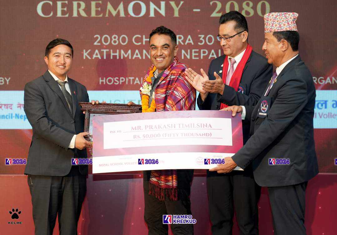 काठमाडौं (हाम्रो खेलकुद)– नेपाल भलिबल संघले हाम्रो खेलकुद डटकमका सम्पादक प्रकाश तिमल्सिनालाई सम्मान गरेको छ ।संघले शुक्रबार आयोजना गरेको चौथो एनभिए अवार्डका क्रममा सम्पादक तिमल्सिनालाई सम्मान गरेको हो । राष्ट्रिय खेलकुद परिषद् (राखेप) सदस्य सचिव टंकलाल घिसिङ, एनभिएका अध्यक्ष जीतेन्द्रबहादुर चन्द, महासचिव रोशन श्रेष्ठले तिमल्सिनालाई सम्मान गरेका हुन् । सम्मान पत्रसहित तिमल्सिनालाई ५० हजार रुपैयाँ […]