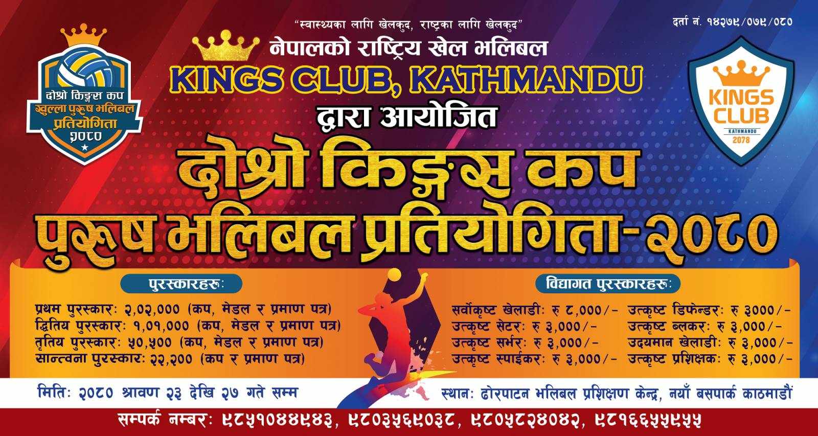 काठमाडौं (हाम्रो खेलकुद) – दोस्रो संस्करणको किङ्स कप पुरुष भलिबल प्रतियोगिता साउन चौथो सातादेखि हुने भएको छ । आयोजक किङ्स क्लब काठमाडौंले दोस्रो किङ्स कप पुरुष राष्ट्रिय भलिबल साउन २३ गतेबाट २७ गतेसम्म हुने जानकारी गराएको छ । प्रतियोगितामा विभागीय जुनसुकै क्लबले पनि सहभागित जनाउन पाउने आयोजकले जनाएको छ । तर, यसै महिना (असार) मा […]