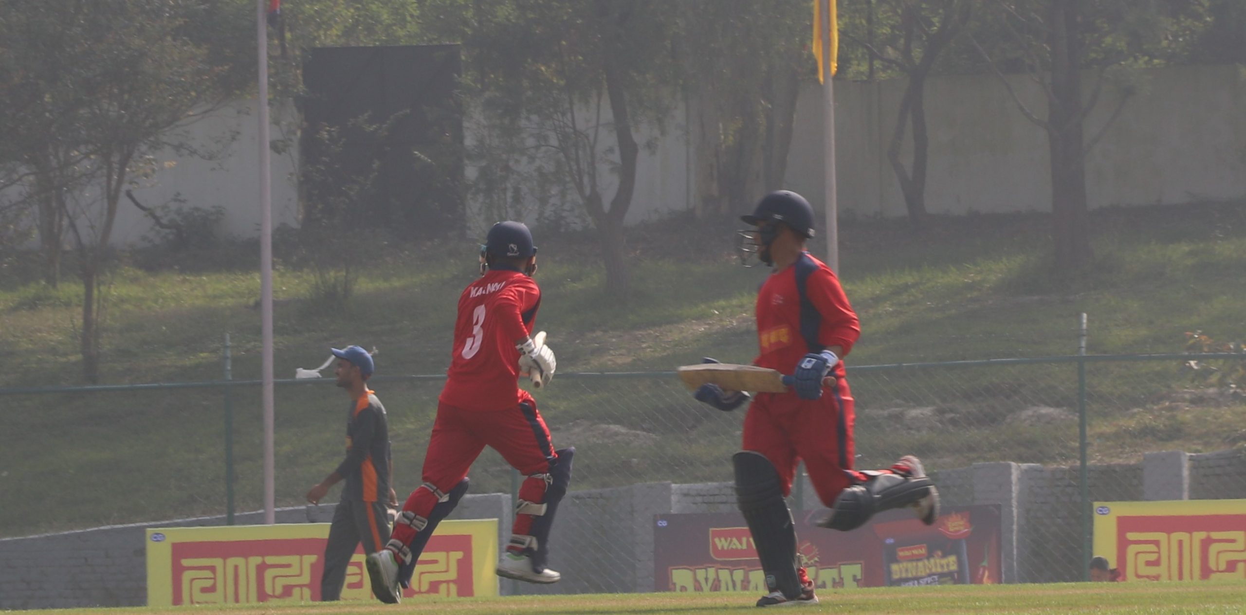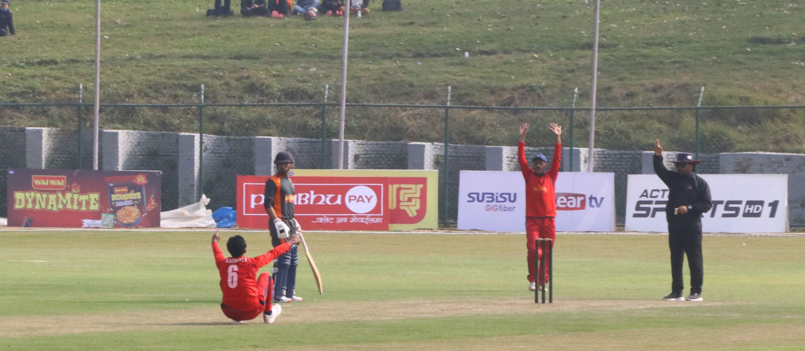 प्रकाश जैशीले छैटौं ओभरको पाँचौं बलमा विराट भण्डारीलाई रुपक दाहालबाट ६ रनमा क्याच गराए । आठौं ओभरको तेस्रो बलमा जैशीले विशाल विक्रम केसीलाई १ रनमा बोल्ड आउट गरे । तीन बलपछि सुनिल भण्डारी एलबीडब्लू आउटको शिकार बने । चनाराले नवौं ओभरको चौथो बलमा ओपनर आकाश त्रिपाठीलाई १५ रनमा बोल्ड आउट गर्दै पेभेलिएन फर्काएका थिए । १२ औं ओभरको दोस्रो बलमा प्रकाशले वासिर अहमदलाई ४ रनमा बोल्ड आउट गरे ।