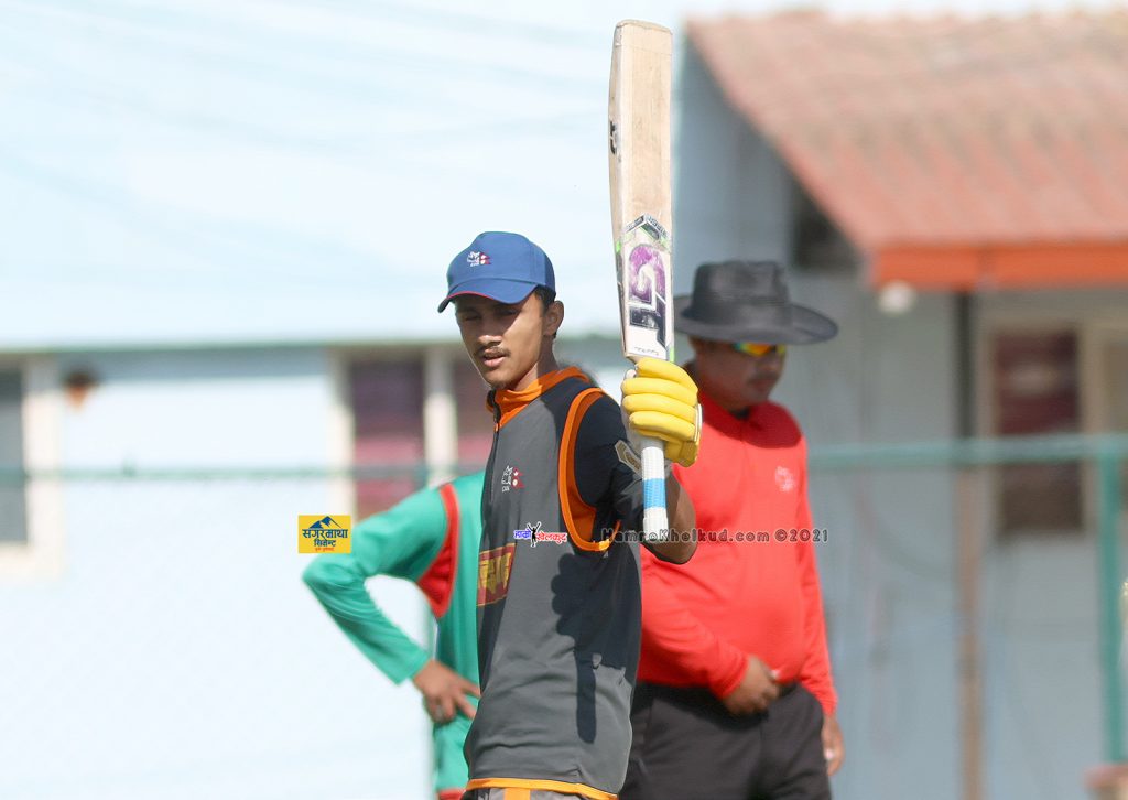 तीव्र गतिका बलर हेमन्त धामीले पहिलो ओभरको दोस्रो बलमै ओपनर शून्यमा आउट भएका थिए । दोस्रो विकेटका लागि प्रज्वल थापा र देवले ७८ रनको साझेदारी गरे । प्रज्वल ५३ बलमा ३ चौका र १ छक्का सहित २४ रनमा क्याच आउट भए । आकाशको १९ औं ओभरको अन्तिम बलमा थर्डमा नरेन्द्र साउदबाट क्याच भएका थिए । स्पिनर शेर मल्लको बलमा विराट भण्डारी विकेटकिपर अर्जुन साउदबाट क्याच हुँदै गोल्डेन डक पेभेलिएन फर्के ।