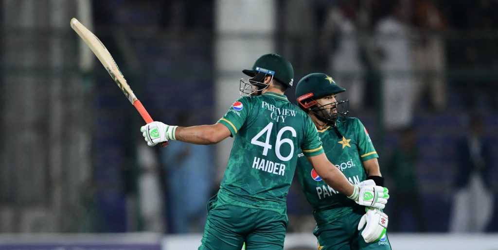 युवा ब्याटर हैदर अलीले ३९ बलमा ६ चौका र ४ छक्कासहित ६८ रनको उत्कृष्ट इनिङ खेले । कप्तान बाबर आजम शून्यमा आउट भएपनि तेस्रो विकेटका लागि रिजवान र हैदर अलीले १ सय ५ रनको शतकीय साझेदारी गर्दै विशाल योगफलमा पुर्याएका थिए । मोहम्मद नवाज १० बलमा ३ चौका र २ छक्कासहित ३० रनमा अविजित रहे ।