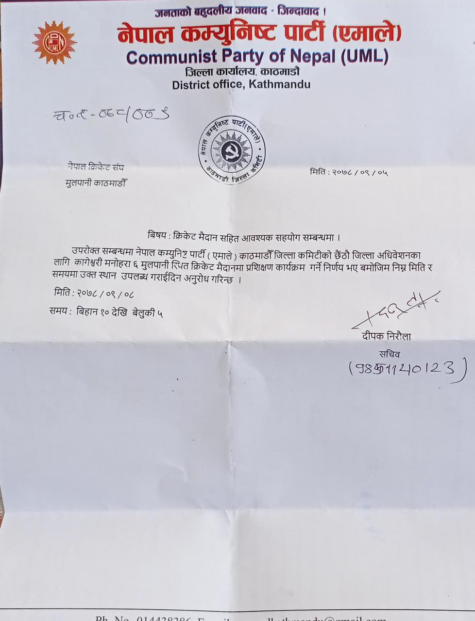 यसअघि पुष ८ गते मुलपानीकै माथिल्लो मैदानमा काठमाडौं जिल्ला एमाले वैठक र प्रशिक्षण गरेका थियो । मैदानभित्र टेन्ट मात्र गाडिएको थियो । आउटफिल्ड र मैदानकोबीच भागमै गाडी, मोटरसाइकल चलाउनुको साथै ठूलो मात्रमा मैदानमै हुल पसेको थियाो । उक्त कार्यक्रमले नै आउटफिल्ड र पिच दुवैमा असर पुगिसकेको छ । त्यसैपनि उक्त मैदानमा आउटफिल्डको घाँस उमार्न र पिच राम्रो अवस्थामा राख्न निकै कठिन हुन्छ । तर काठमाडौं जिल्ला एमालले भने क्रिकेट मैदानलाई नै खुल्ला चौर जसरी प्रयोग गरेको थियो ।