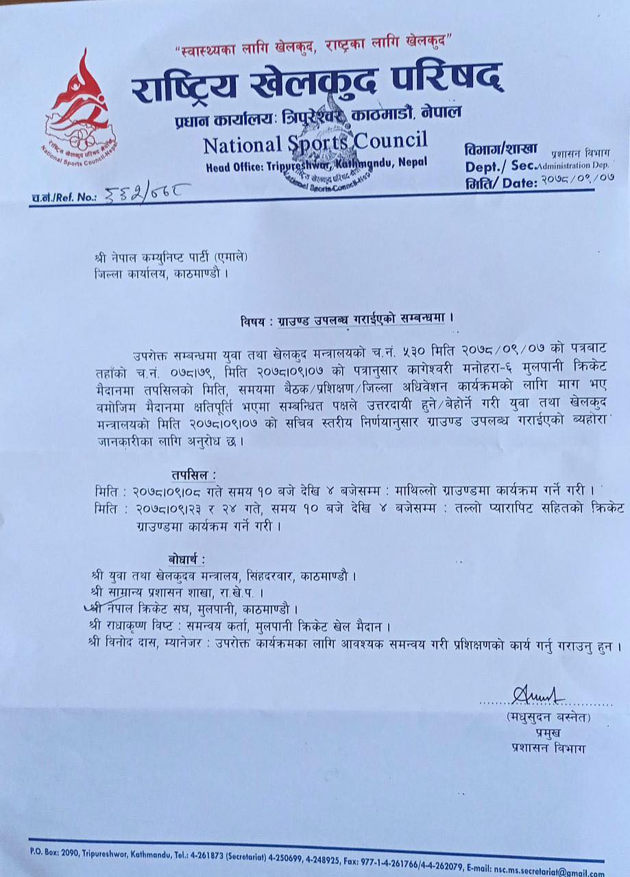 राष्ट्रिय खेलकुद परिषद् (राखेप) ले पुष ७ गते पत्र काट्दै बैठक, प्रशिक्षण र अधिवेशन कार्यक्रमको लागि उपलब्ध गराइएको जनाएको छ । युवा तथा खेलकुद मन्त्रालयको पुष ७ गतेको सचिवस्तरिय निर्णय अनुसार क्षतिपूर्ति भएमा सम्बन्धित पक्षले बेर्होने भन्दै राखेपका प्रशासन विभाग प्रमुख मधुसुदन बस्नेतले उक्त पत्र काटेका छन् ।