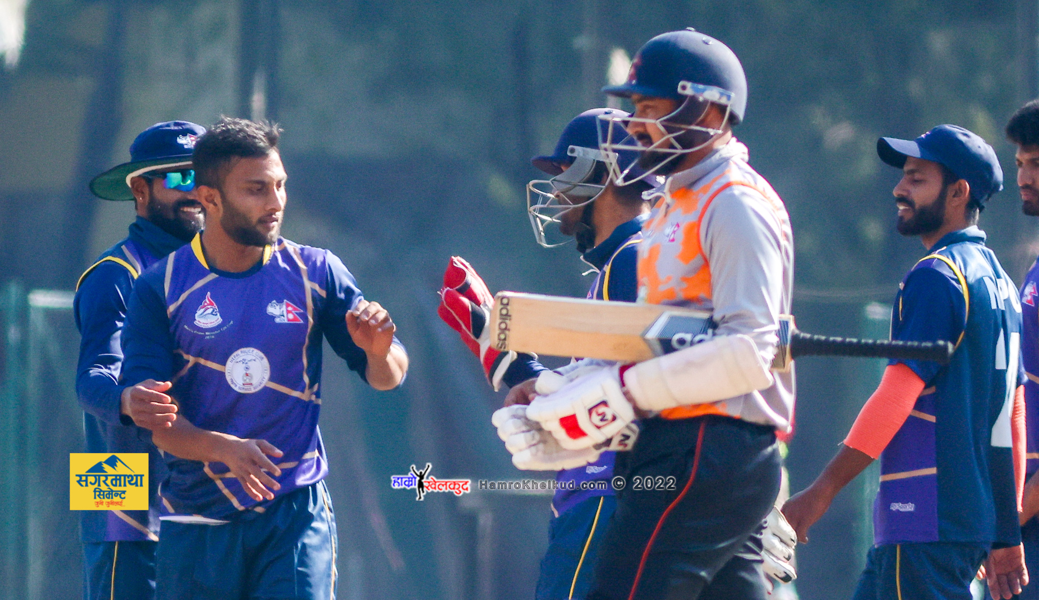 अमरसिंह राउटेलाले अनिल शाहलाई १० रनमा क्याच गराए । दीपक बोहराको डाइरेक्ट थ्रोमा आरिफ शेख १२ रनमा रन आउट भए । विकेटकिपर दीलिप नाथ दीपकको बलमा बोल्ड आउट हुनुअघि २२ बलमा २ चौकासहित २३ रन जोडे ।