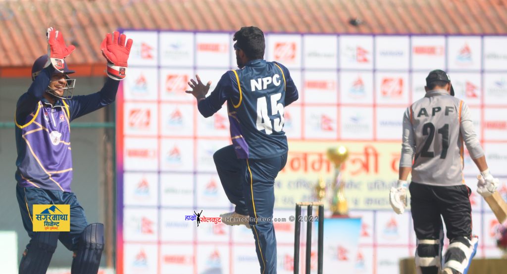 एपिएफका किशोर महतोले ४ ओभरमा १७ रन खर्चेर ३ विकेट लिए । अमरसिंह राउटेला, अभिनाश बोहरा दीपक बोहराले १–१ विकेट लिए ।