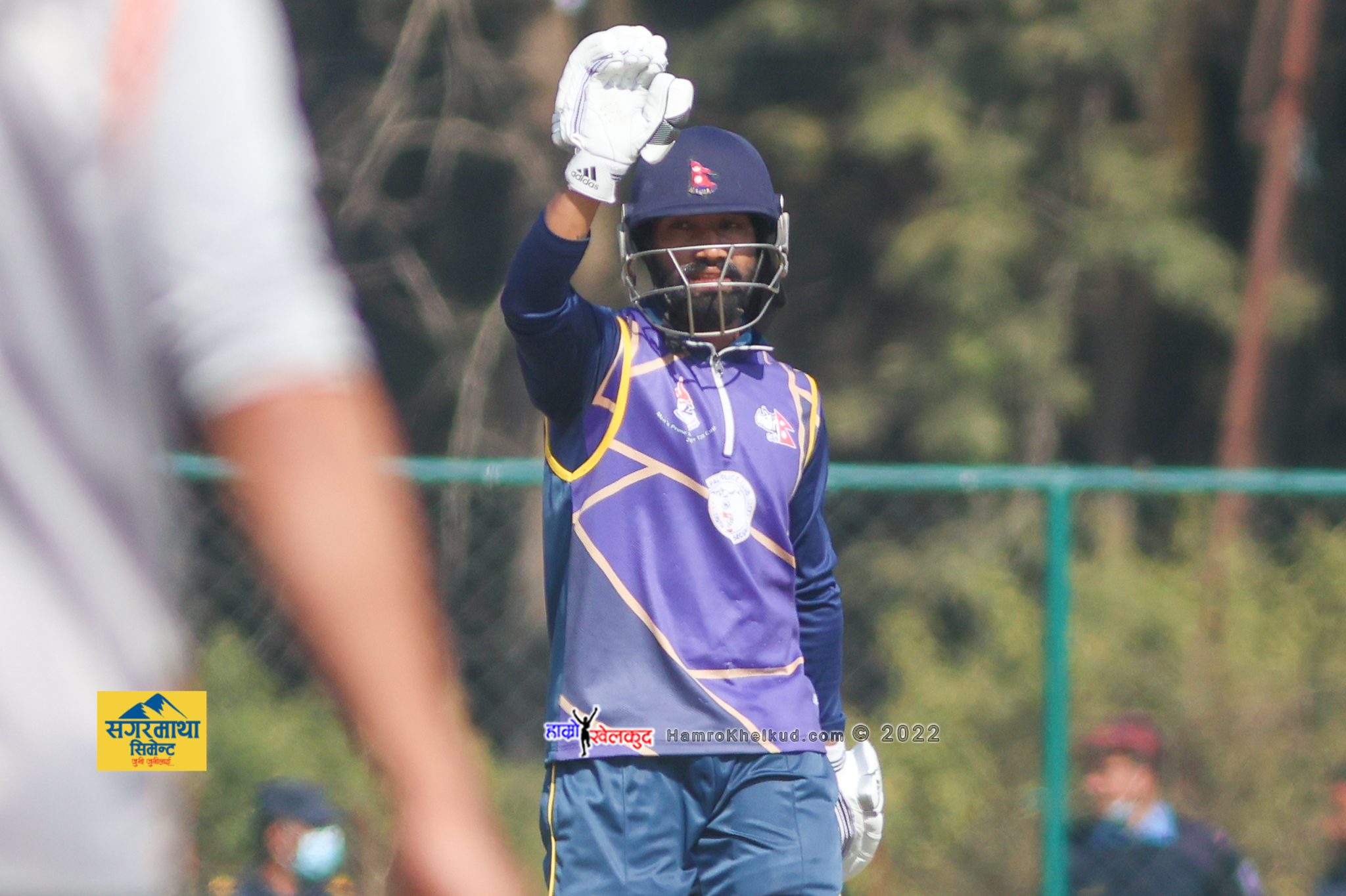 जुन समय दीपेन्द्र २७ रनमा क्रिजमा थिए । दीपकको १३ औं ओभरको तेस्रो बलमा दीपेन्द्रले ३९ रनमा अर्को जीवनदान पाए । एक्स्ट्रा कभरमा अभिनाश बोहराले क्याच ड्रप गरेका थिए । तीव्र गतिका बलर किशोर महतोले पहिलो बलमै ओपनर पवन सरार्फलाई मिडअनमा सन्दीप जोराबाट क्याच गराउँदै गोल्डेन डक पेभेलिएन फर्काएका थिए । किशोरकै तेस्रो ओभरको पाँचौं बलमा अर्का ओपनर अमित श्रेष्ठ एज लागेर विकेटकिपर आसिफ शेखबाट ३ रनमा क्याच आउट भए ।